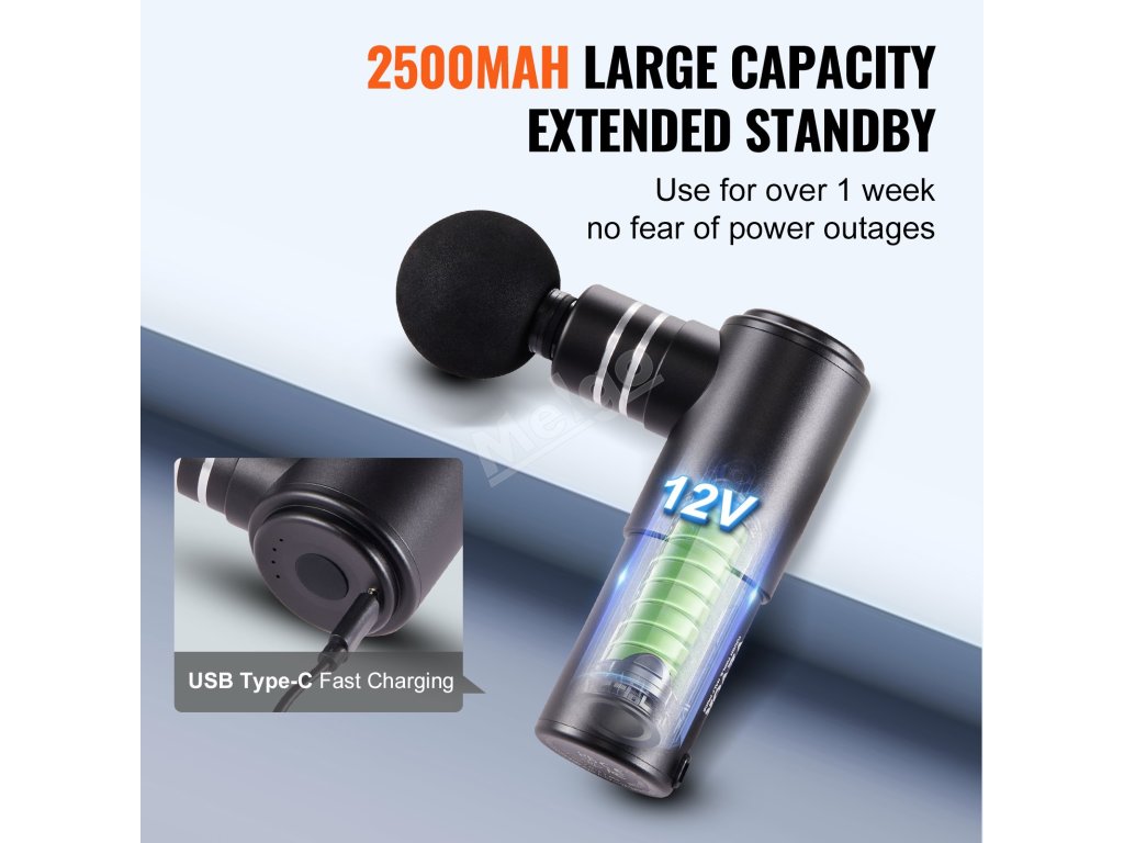 Tato ruční masážní pistole je vybavena vysokokapacitními bateriemi s napětím 12 V a kapacitou 2500 mAh, které zaručují dlouhou životnost a odstraňují potíže s častým dobíjením. Díky rychlému nabíjení přes rozhraní USB typu C ji můžete udržovat v chodu kdykoli a kdekoli, čímž poskytuje nepřetržitou podporu vašemu zdraví.