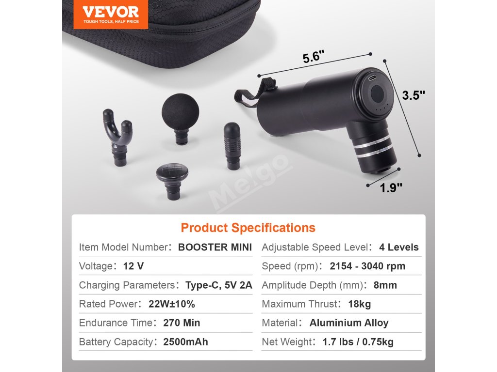Dodejte svým svalům energii a oživte své tělo pomocí masážní pistole VEVOR. Kombinuje výkonný a zároveň tichý bezkartáčový motor s vysokým točivým momentem, 4 přizpůsobitelná nastavení rychlosti, 4 masážní hlavice a vysokokapacitní 12voltové baterie s kapacitou 2 500 mAh, a tak se s přesností a lehkostí zaměřuje na hlubokou svalovou únavu a bolest.
