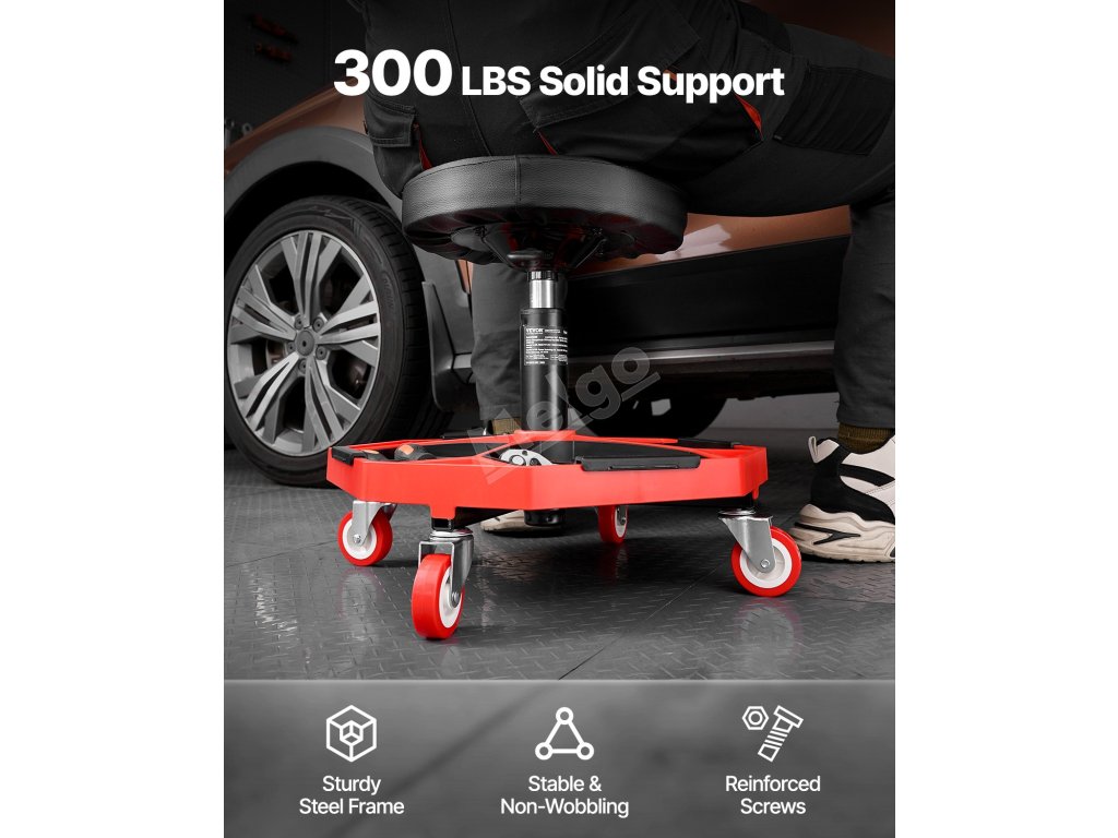 Naše sedačka pro opravy v garáži má odolný ocelový rám a zesílené šrouby s nosností 300 liber. Nabízí stabilitu, pohodlí a správnou výšku, takže můžete pracovat bez dlouhého ohýbání nebo klečení.