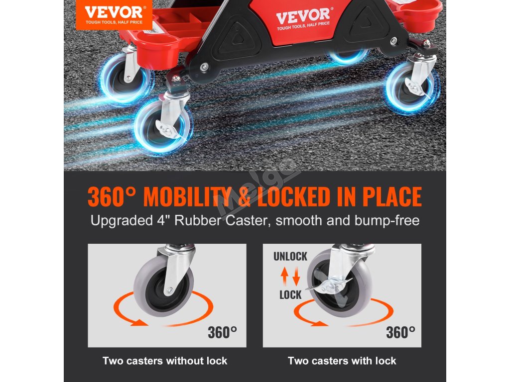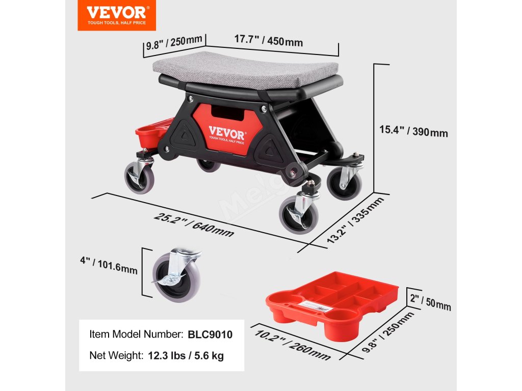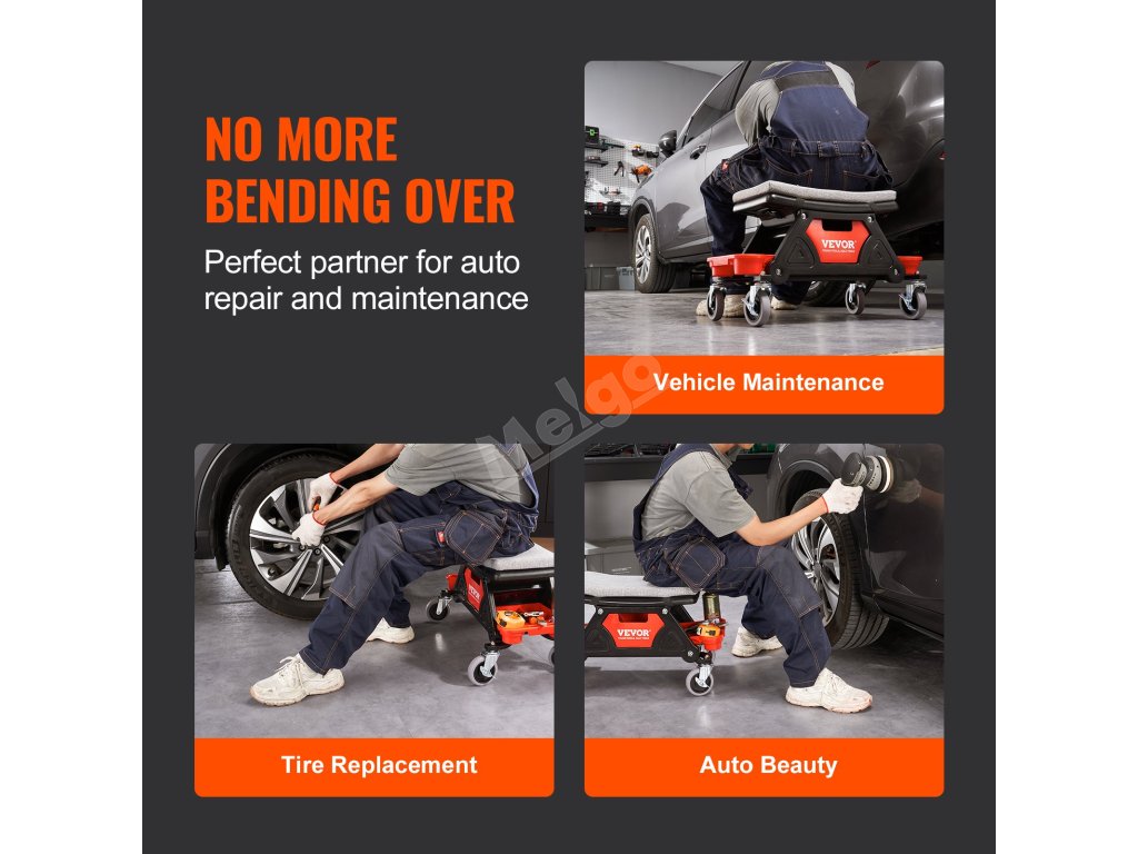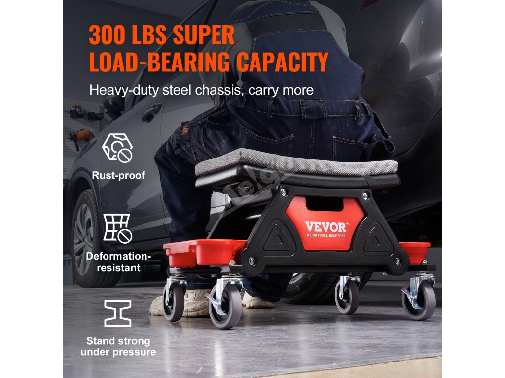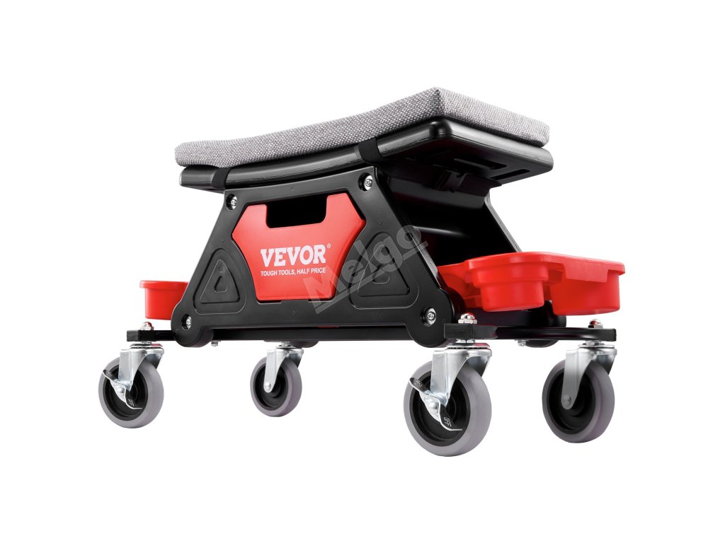 Toto sedadlo na kolečkách zajišťuje hladký klouzavý pohyb díky 4palcovým univerzálním gumovým kolečkům a možnosti otáčení o 360°. Silný houbový polštář a ergonomický design sedadla poskytují maximální pohodlí, zatímco tři úložné přihrádky udržují vaše nářadí uspořádané a na dosah.