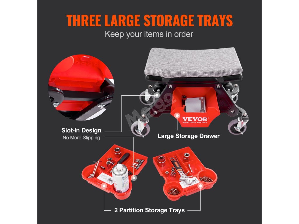 Zvyšte svou produktivitu díky přehlednému uspořádání nástrojů a předmětů. Naše mechanické válečkové sedadlo se může pochlubit třemi úložnými prostory navrženými pro maximální efektivitu. Velká přihrádka poskytuje dostatek úložného prostoru pro různé nástroje, takže se můžete soustředit na práci při údržbě a nemusíte přebíhat sem a tam.
