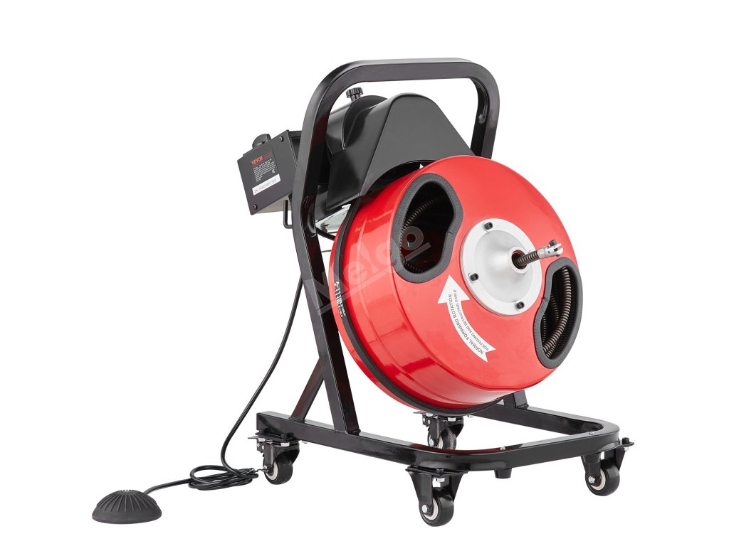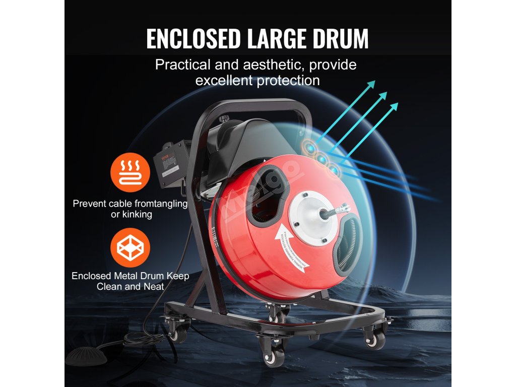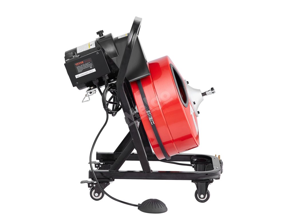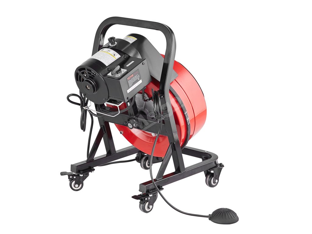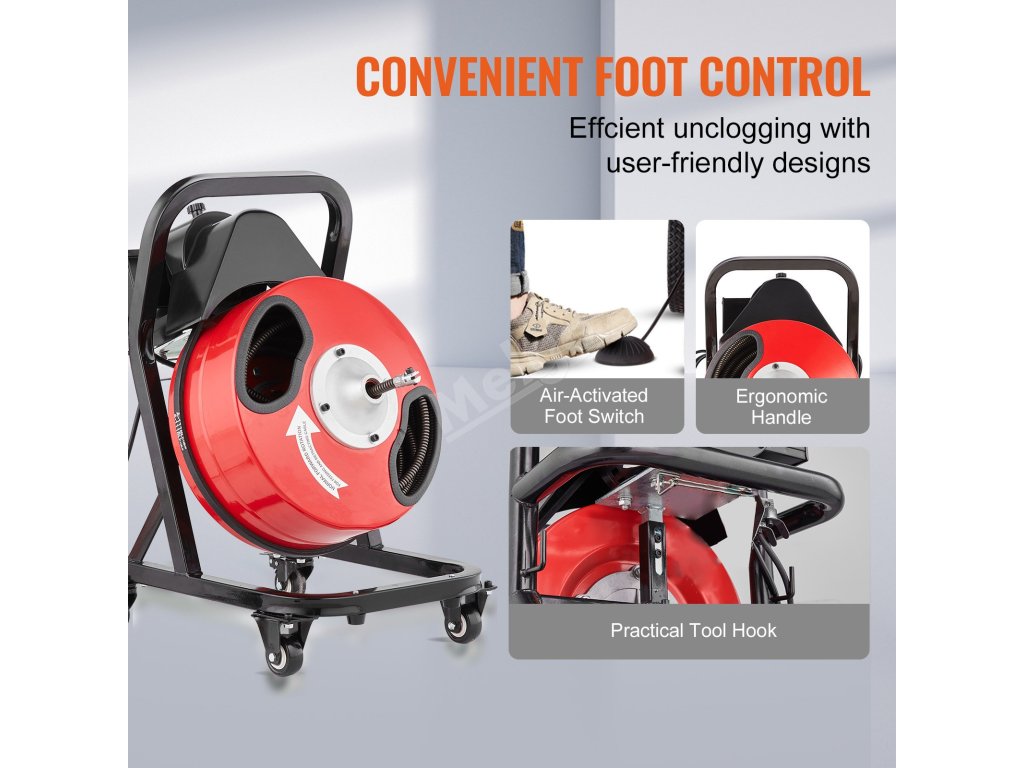 Tento elektrický odvodňovací vrták je vybaven kolečky pro snadnou přepravu a ergonomickou rukojetí pro pohodlné držení. Díky přepínači CW/CCW a nožnímu spínači aktivovanému vzduchem je ovládání kabelu bezproblémové a můžete si poradit s ucpanými trubkami, odtoky, umyvadly a toaletami