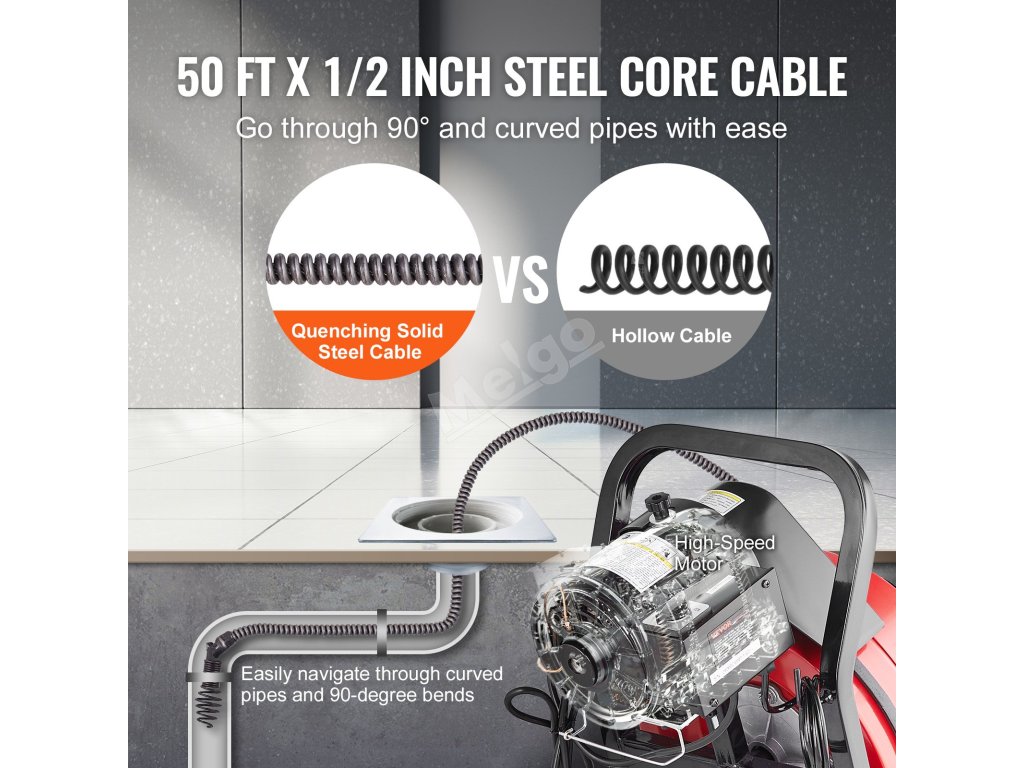 Naše 50FT x 1/2" ocelové jádro má vysokou houževnatost, která snadno projde více zakřivenými trubkami a odstraní ucpané potrubí. Tento kabel je navržen tak, aby odolával korozi, rzi a zamotávání, a zaručuje tak dlouhotrvající výkon při různých instalatérských úkolech.