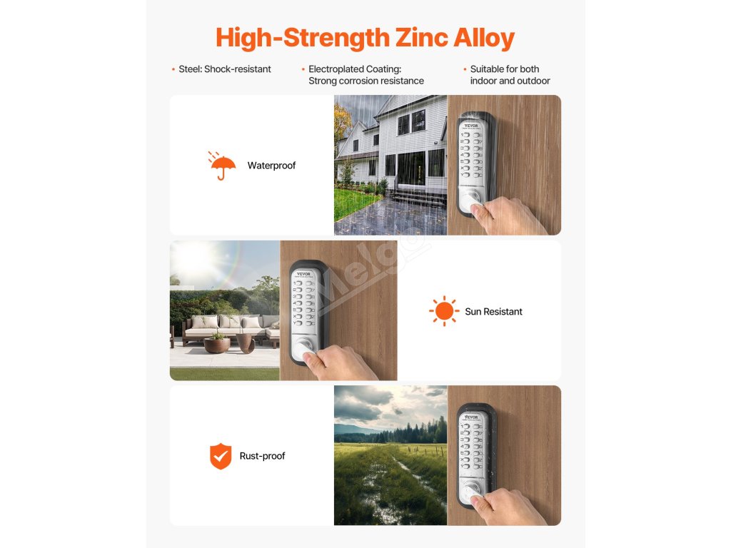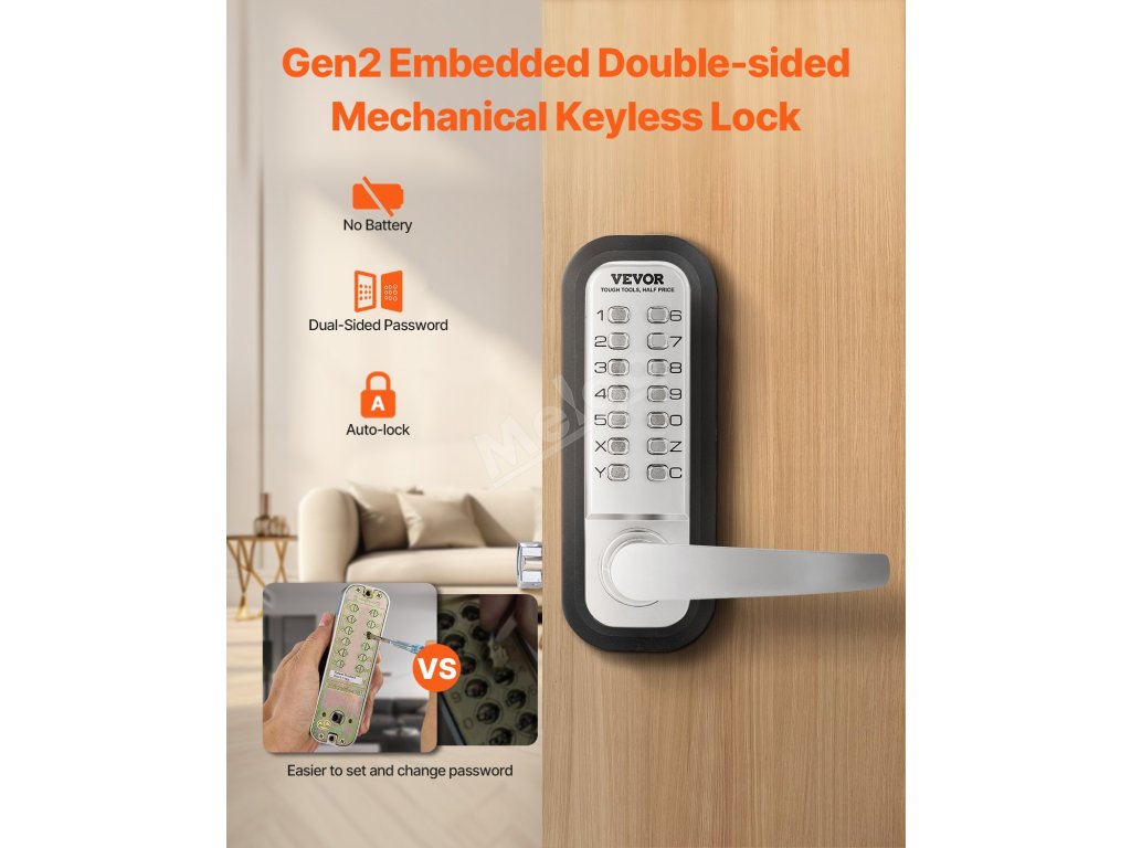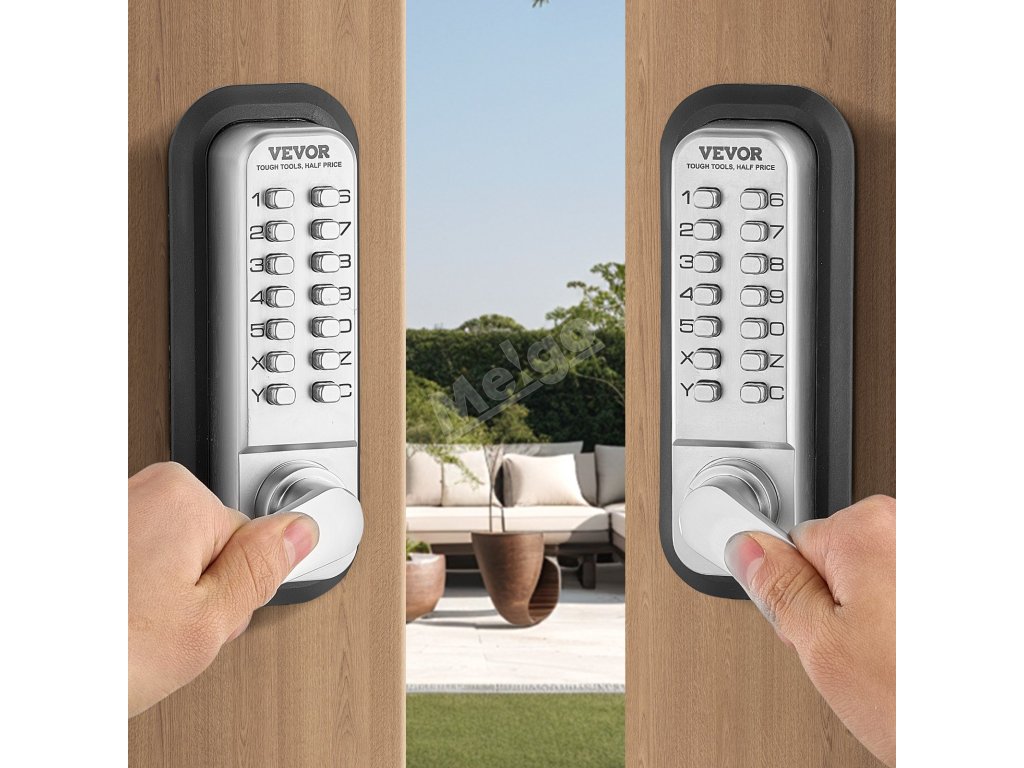 Mechanický bezklíčový zámek dveří druhé generace nevyžaduje žádné kabely ani klíče a automaticky se zamkne při zavření dveří, čímž poskytuje skvělou ochranu proti krádeži. Oboustranný zámek zabraňuje vniknutí cizích osob dovnitř, takže je ideální na dvorky. Změna hesla je snadná pomocí šroubováku.