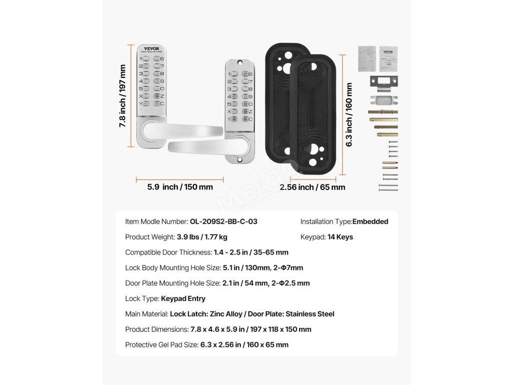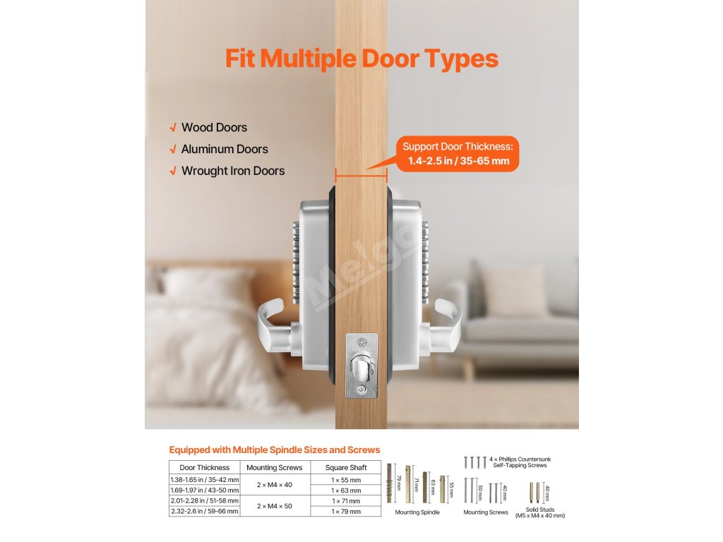 Tento mechanický bezklíčový zámek dveří je kompatibilní s dveřmi o tloušťce 35-65 mm (1,4 až 2,5 palce). Dodává se s několika sadami montážních vřeten a šroubů, což vám umožní vybrat si vhodné montážní kování pro váš typ dveří a zvýšit tak flexibilitu a pohodlí.