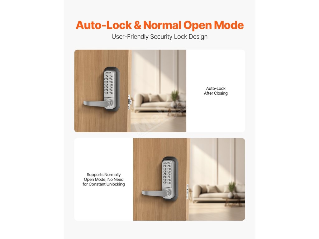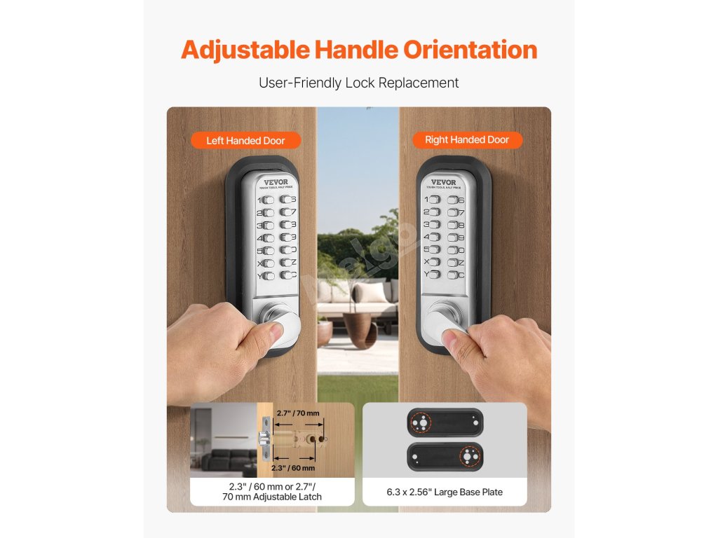 Tento bezklíčový mechanický kombinovaný dveřní zámek je navržen s nastavitelnými klikami, pohyblivými úderníky a zvětšenými montážními deskami a umožňuje nahradit staré dveřní kování bez dalšího řezání nebo vrtání. Jednoduše vyměňte starý zámek za nový, abyste zachovali vzhled svých dveří.