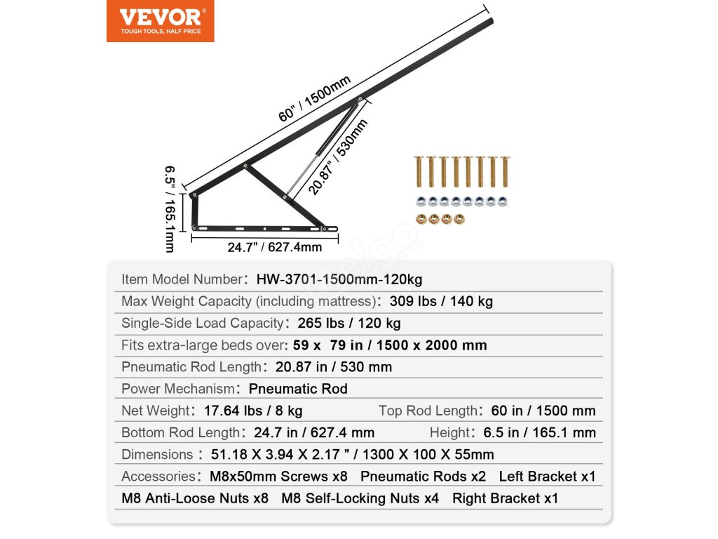 Tato hydraulická sada pro zvedání postelí je vhodná pro rozkládací pohovky nebo postele o rozměrech 59 × 71". Mechanismus lze orientovat tak, aby se otevíral z boku nebo z konce postele.