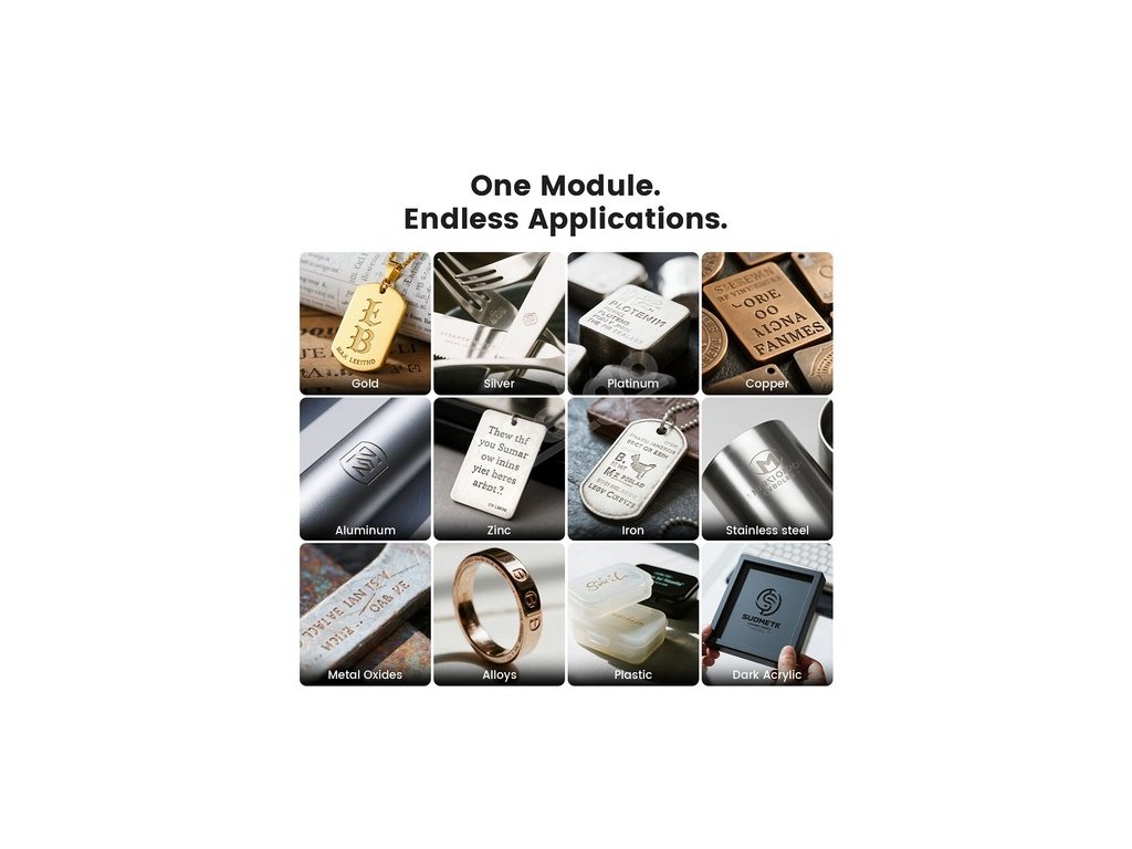 Infračervený laserový modul Mecpow R1 1064 nm je určen k gravírování do různých kovů, včetně zlata, stříbra, platiny, mědi, hliníku, zinku, železa, nerezové oceli, oxidů kovů, slitin, plastů a tmavých akrylátů.