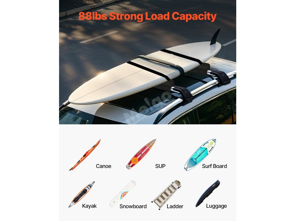 Vytvořte si na střeše další úložný prostor a bezpečně přepravujte kajaky, surfová prkna, longboardy, pádla, lyže, kánoe a další outdoorové vybavení pomocí pevných popruhů na suchý zip a vázacích popruhů, které jsou ideální pro všechna vaše dobrodružství.