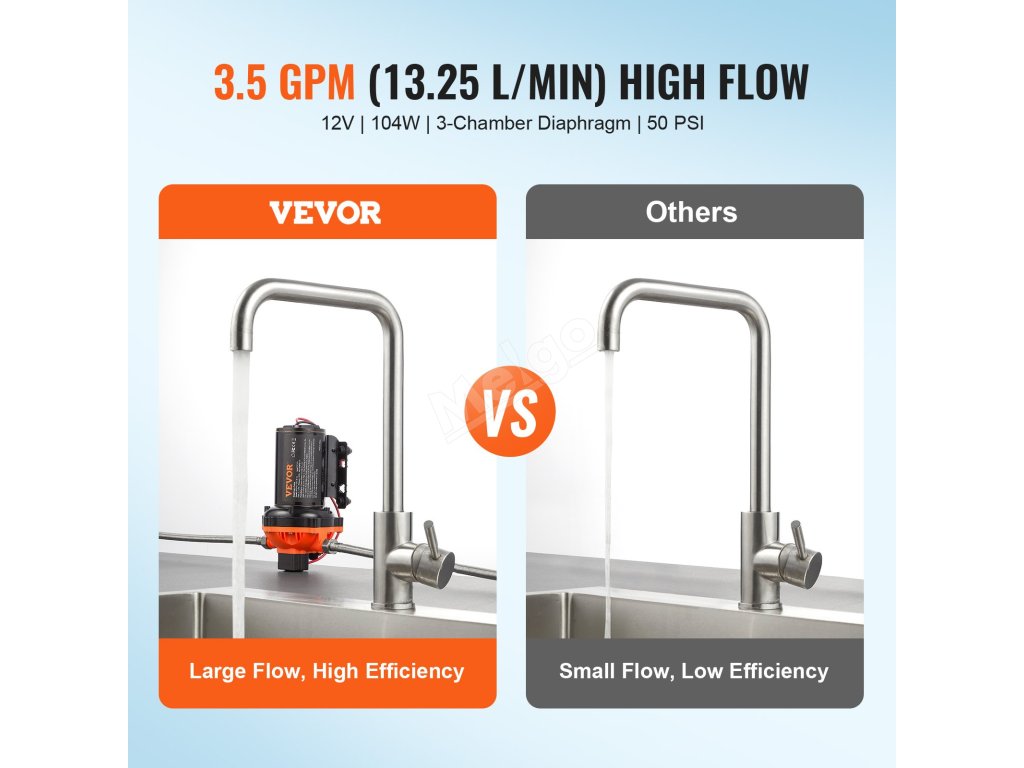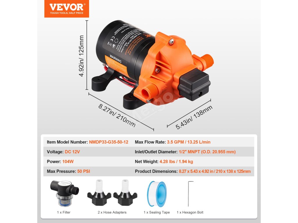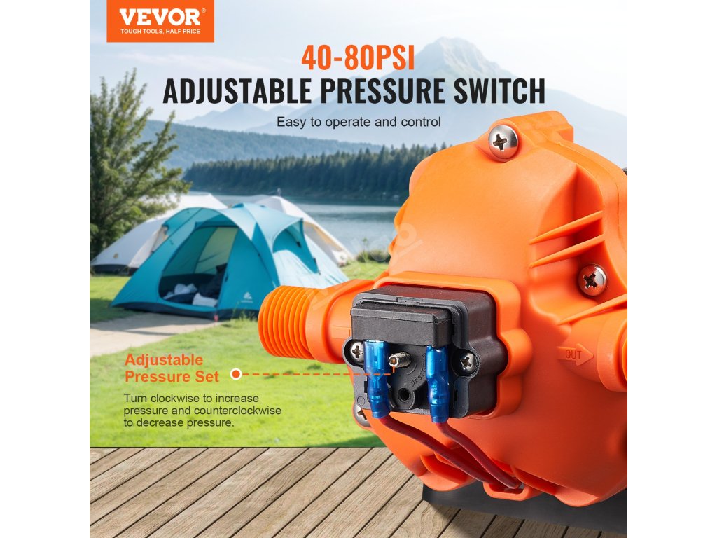 Toto membránové čerpadlo s napětím 12 V poskytuje působivý průtok 13,25 l/min (3,5 GPM) a přednastavený tlak 50 PSI, což zajišťuje efektivní a spolehlivé zásobování vodou. Je vybaveno nastavitelným rozsahem tlaku 40 až 100 PSI, motorem z čisté mědi a standardním 1/2" MNPT portem. Vylepšete svůj vodovodní systém ještě dnes!