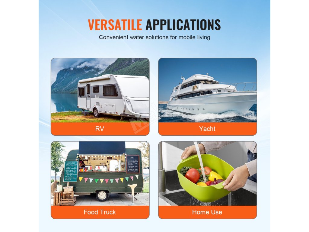 Naše 12V vodní čerpadlo pro obytné vozy bez problémů uspokojí všechny vaše potřeby vody - od mytí a sprchování až po použití toalety a kuchyně. Užijte si život v obytném voze naplno s čerpadlem, které vás podpoří na každém kroku.