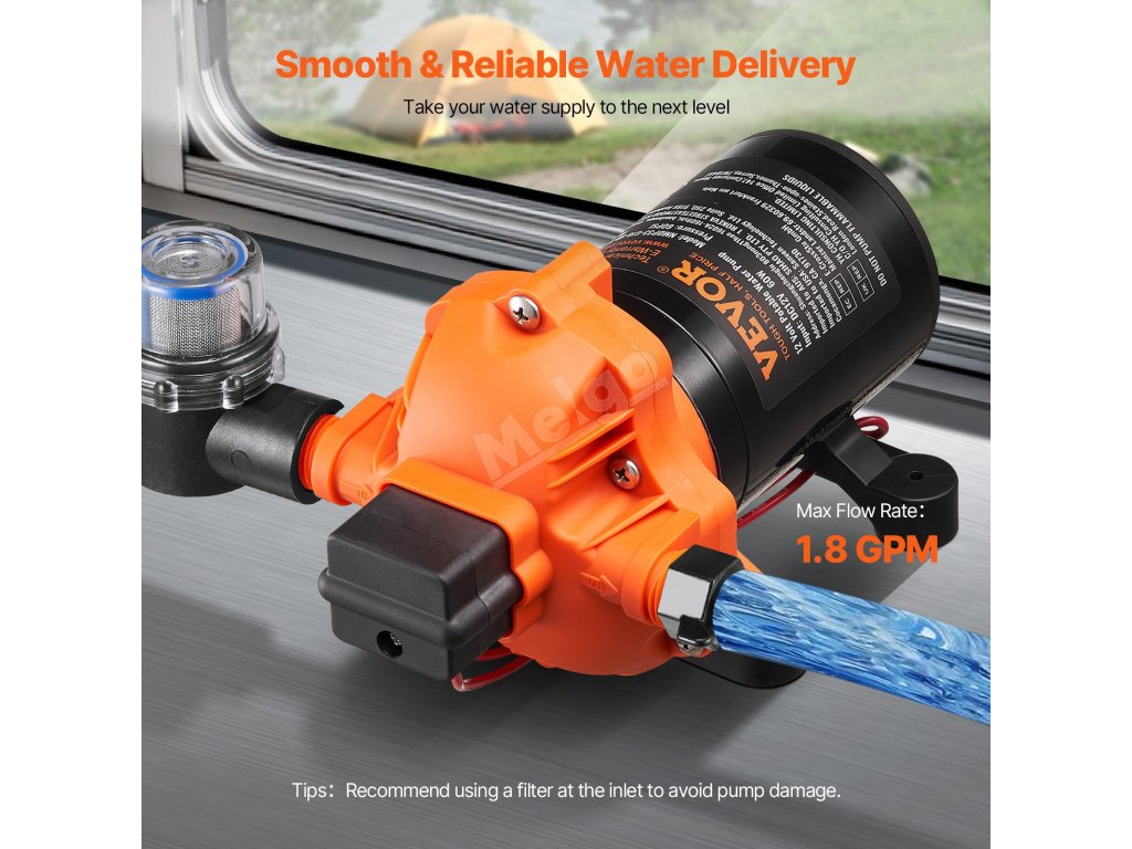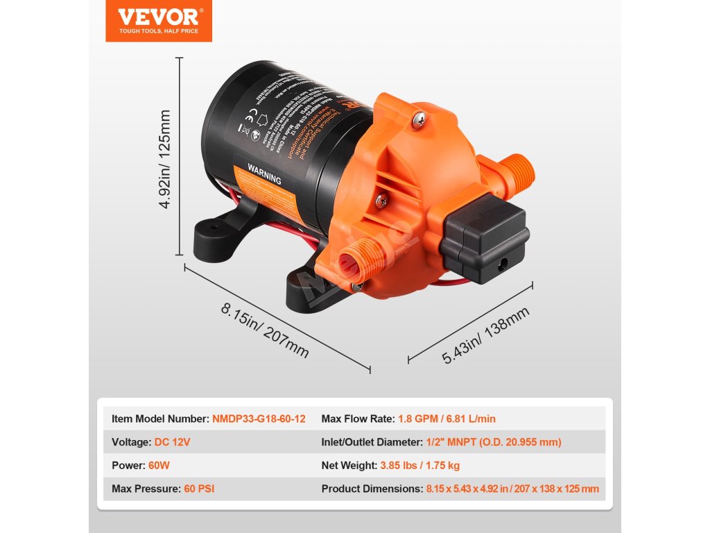 Toto 12voltové membránové čerpadlo poskytuje působivý průtok 1,8 GPM (6,81 l/min) a přednastavený tlak 60 PSI, což zajišťuje efektivní a spolehlivé zásobování vodou. Je vybaveno nastavitelným rozsahem tlaku 40 až 100 PSI, motorem z čisté mědi a standardním 1/2" MNPT portem. Vylepšete svůj vodovodní systém ještě dnes!