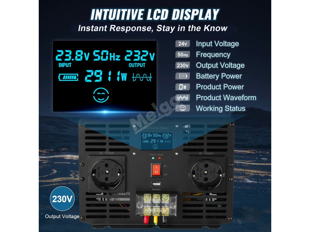 Měnič 24V→230V 3000 W čistý sinus s USB, LCD a EU zásuvkami