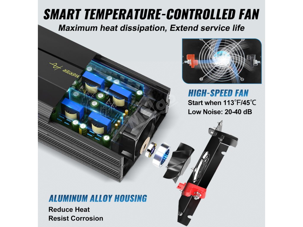 Měnič je pečlivě navržen s přehlednou strukturou, která vám usnadní jeho používání. Když vnitřní teplota dosáhne 113℉/45 ℃, roztočí se chladicí ventilátor, aby snížil teplo. Plášť z hliníkové slitiny má vynikající odolnost proti oxidaci a deformaci.