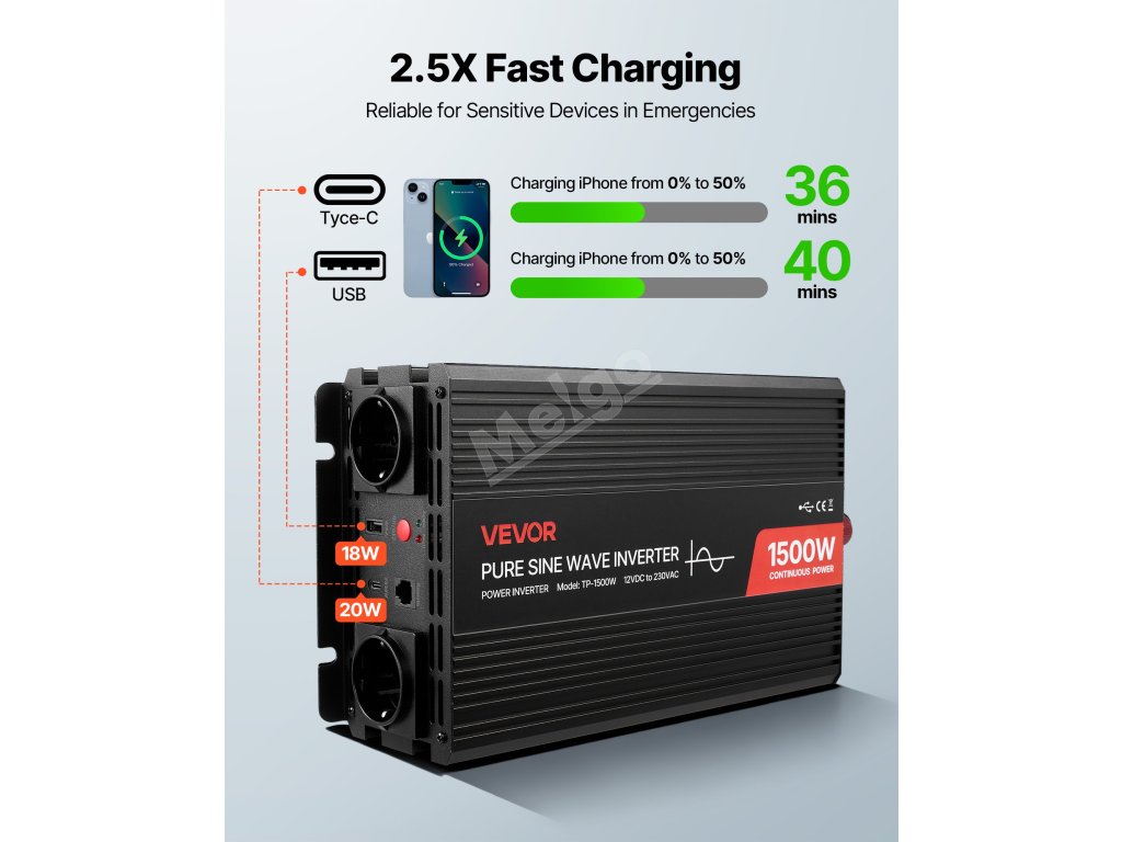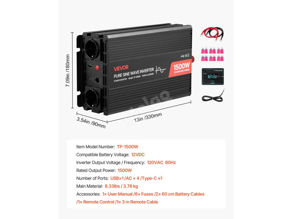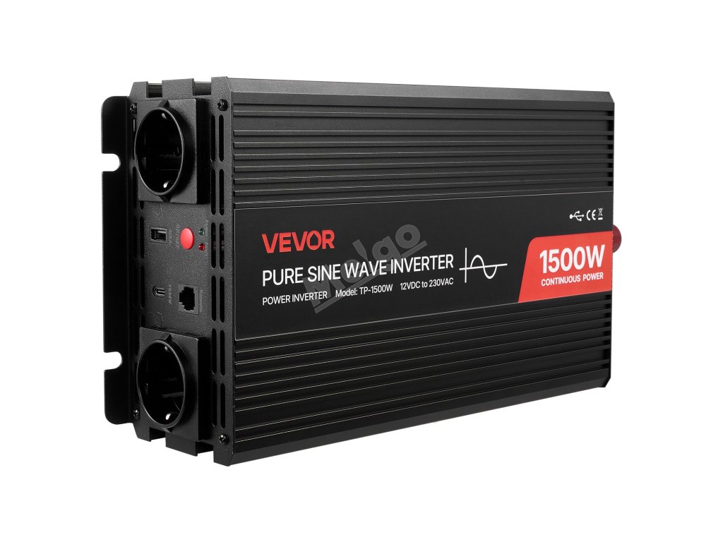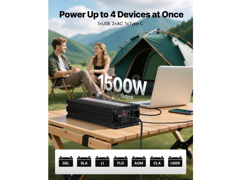 Měnič napětí 1500W 12V DC na 230V AC čistá sinusová, 2×AC, usb-c