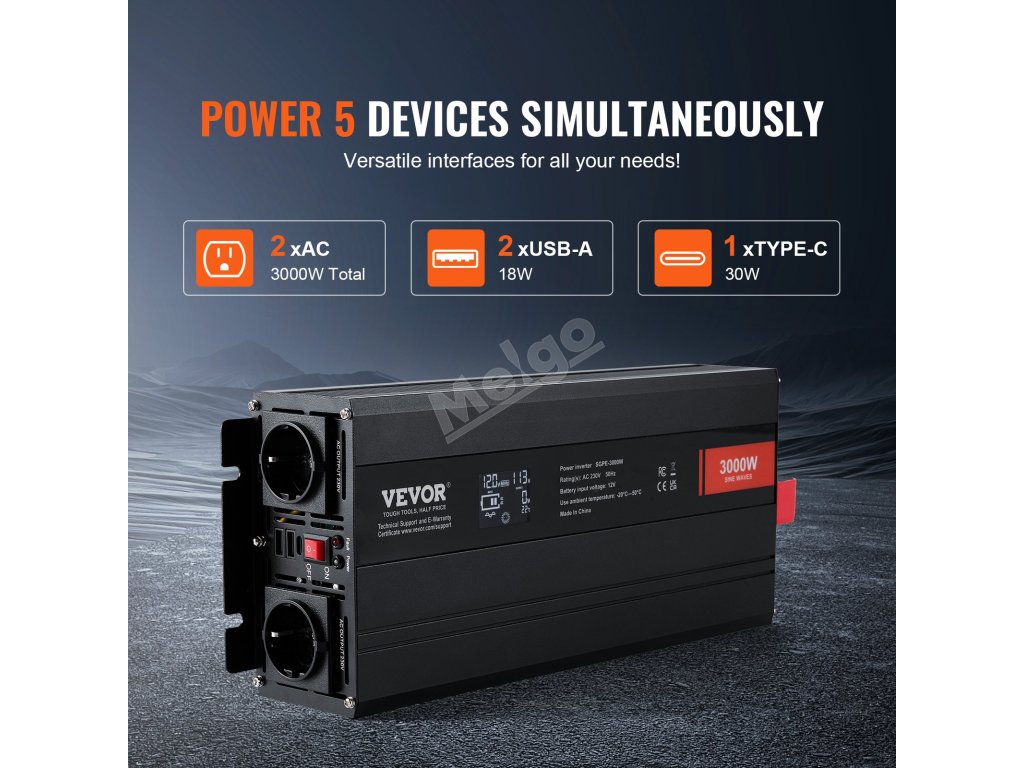 Náš sinusový měnič je vybaven několika rozhraními pro současné napájení až 5 zařízení. Díky pokročilým 6 bezpečnostním ochranám a inteligentnímu chladicímu ventilátoru si můžete vychutnat špičkový výkon a stabilní provoz. Perfektně se hodí do jakéhokoli prostředí - domů, ven nebo do kanceláře. Zvyšte výkon, zbavte se starostí!