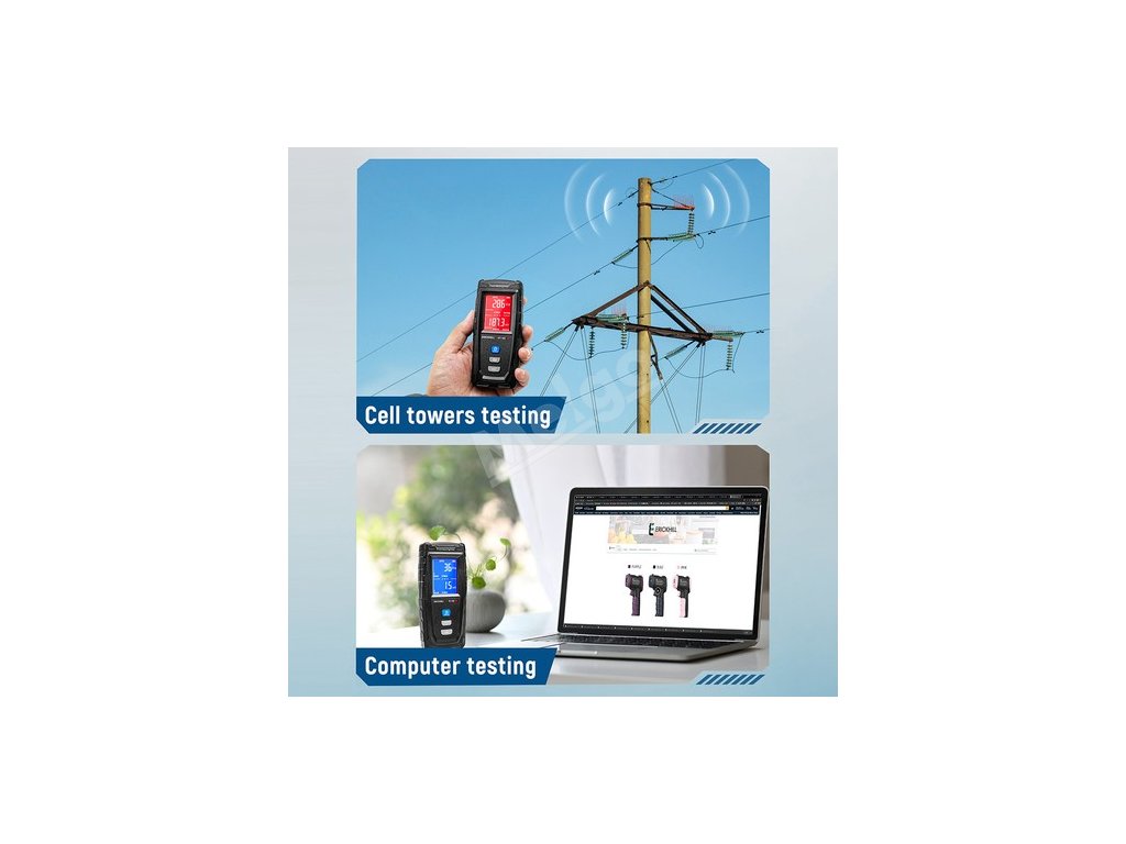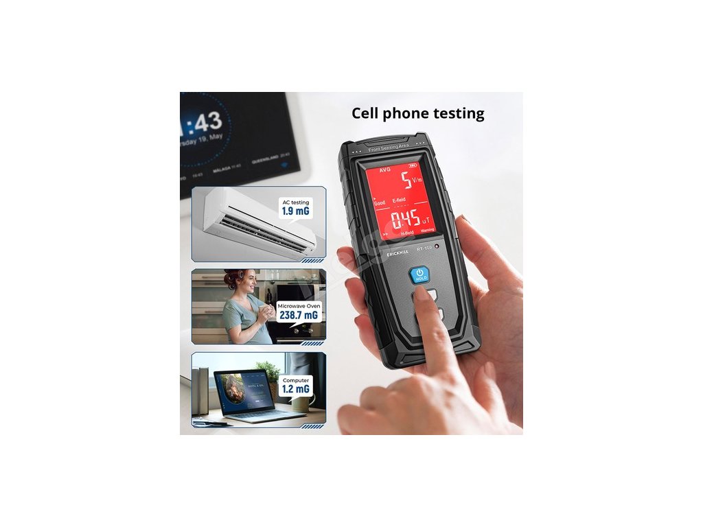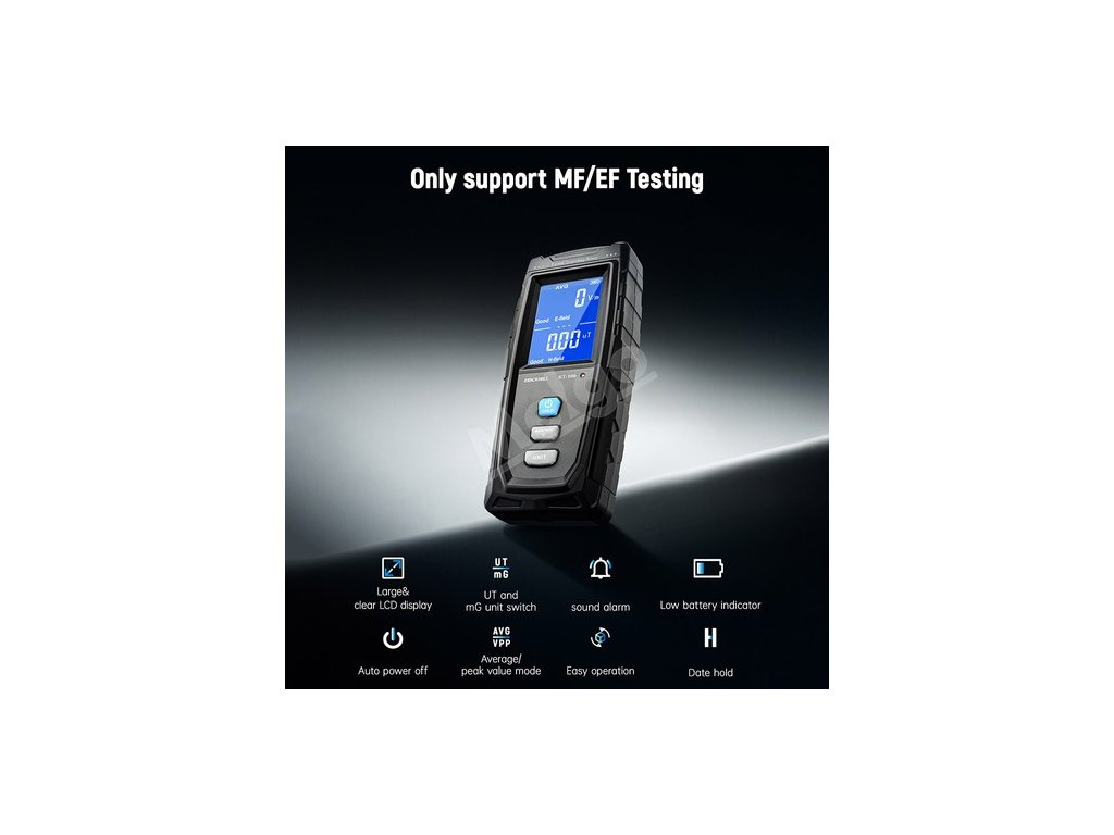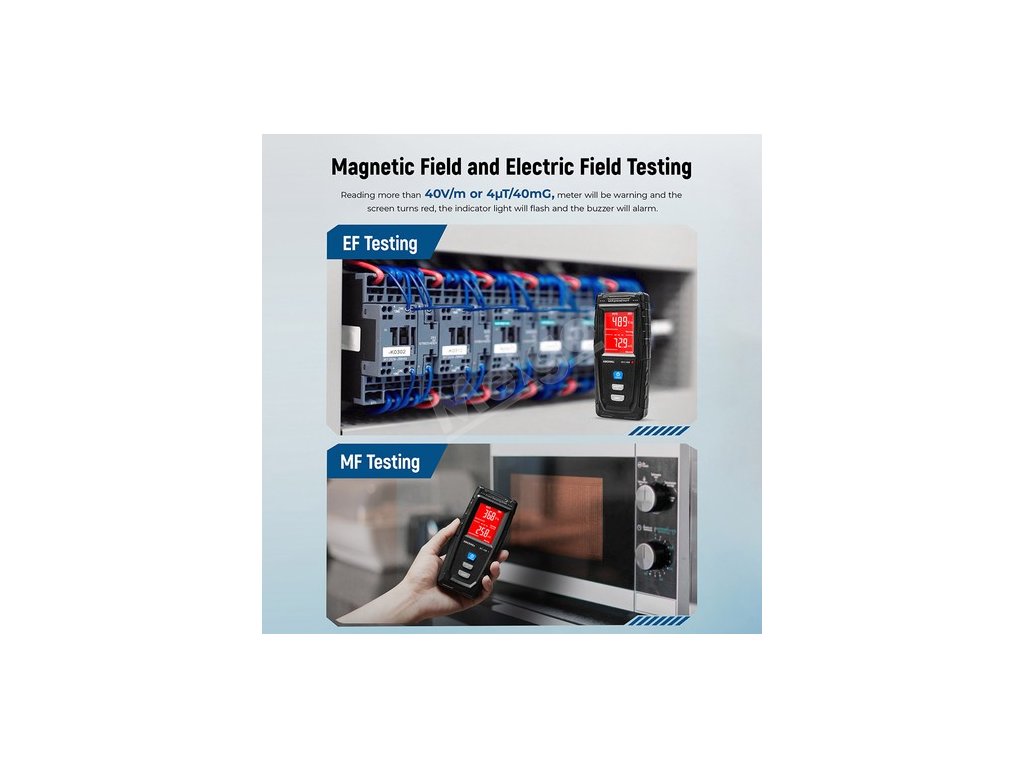 Je vybaven vestavěným senzorem elektromagnetického záření, který po zpracování řídicím mikročipem dokáže zobrazit hodnotu záření na přehledném digitálním LCD displeji. Testování záření magnetického pole s volitelnými jednotkami mG/µT a testování elektrického pole s jednotkou V/m. Tento měřič elektromagnetického pole nemůže testovat hodnotu vysokofrekvenčního záření.