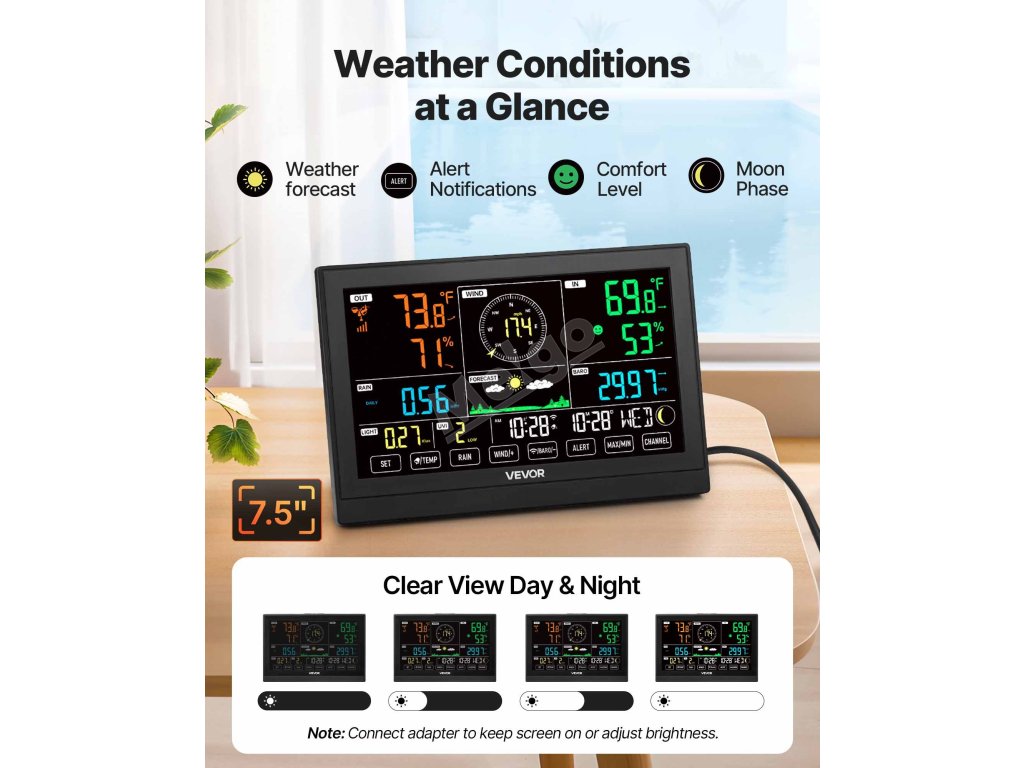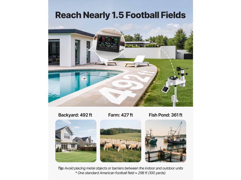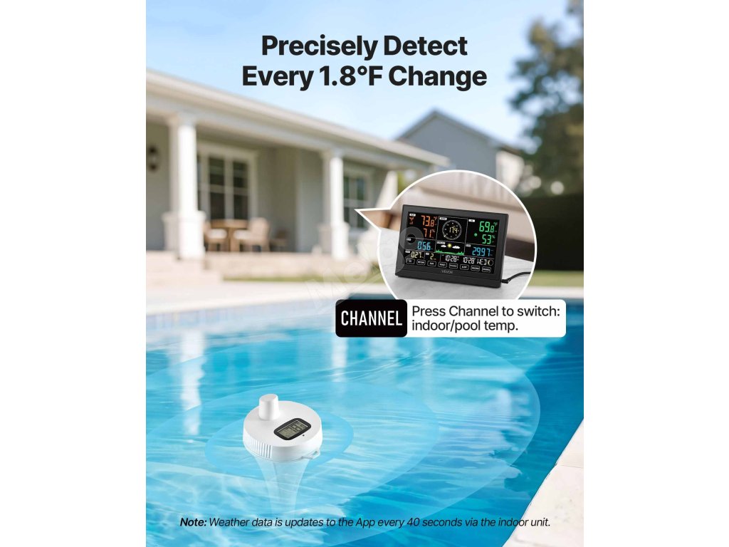 Naše meteorologická stanice monitoruje teplotu, vlhkost, srážky, rychlost a směr větru a obsahuje bazénový teploměr pro přesné sledování teploty vody. Všechny údaje jsou přehledné díky 7,5palcovému displeji. bezdrátový přenos 492 stop (150 m) pro venkovní čidlo a 328 stop (100 m) pro bazénový teploměr.
