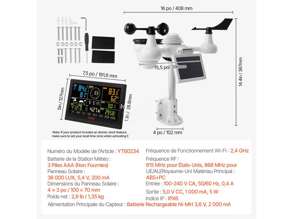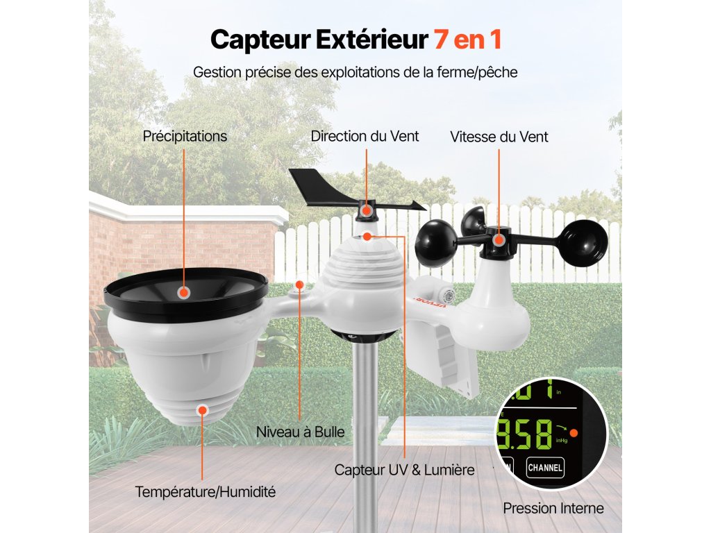 Solárně napájená meteorologická stanice má senzor 7 v 1, který monitoruje rychlost větru, teplotu a vlhkost, srážky atd. Přenáší údaje o počasí v reálném čase prostřednictvím připojení Wi-Fi, zatímco solární panel a baterie Ni-MH poskytují dlouhotrvající napájení. Připravte se na každé počasí s VEVOR!