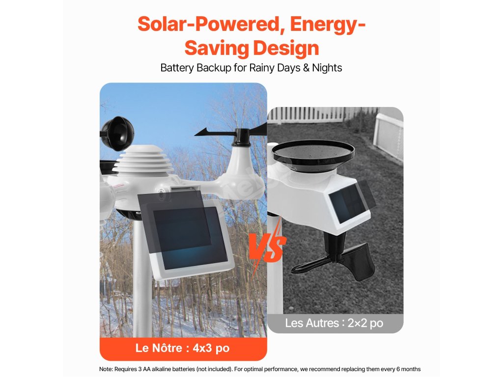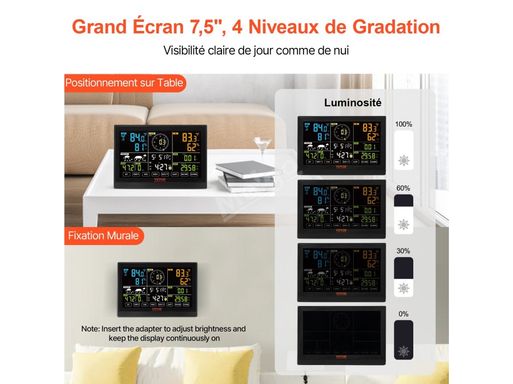 Meteostanice napájená solární energií je vybavena 7,5palcovým velkým displejem, který přehledněji zobrazuje předpovědi počasí a meteorologické údaje. Je vybavena čtyřstupňovým jasem podsvícení, které se přizpůsobí různým prostředím ve dne i v noci.