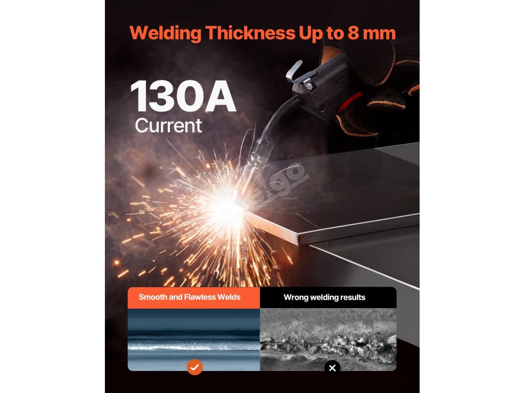 Tato svářečka poskytuje silný výstupní proud 130 A, který umožňuje svařovat materiály o tloušťce až 8 mm.