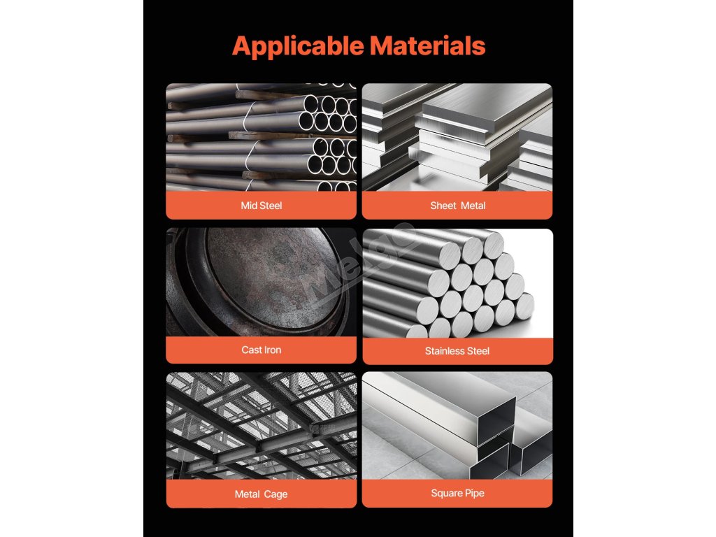 Je kompatibilní s různými materiály včetně měkké oceli, nerezové oceli, litiny, plechu, čtyřhranných trubek a kovové klece.