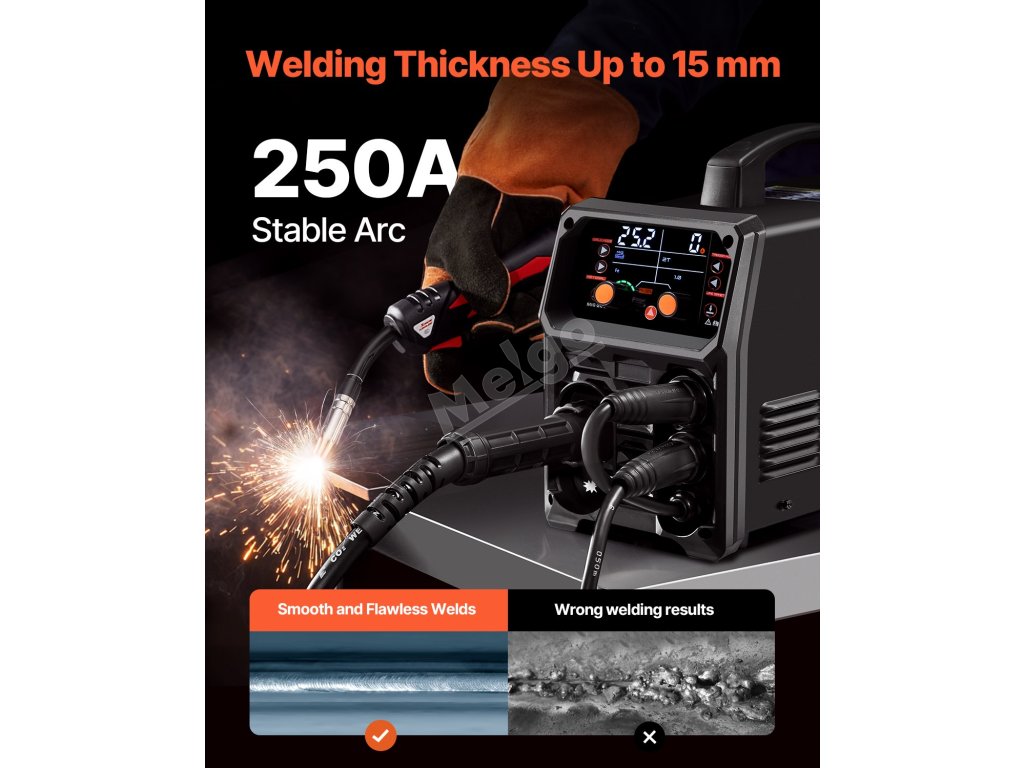 Tato svářečka poskytuje silný výstupní proud 250 A, který umožňuje svařovat materiály o tloušťce až 15 mm.