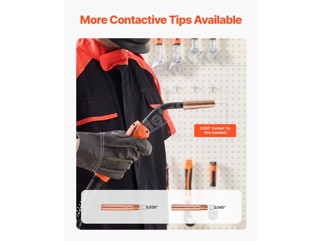 Migová svářecí pistole VEVOR 250A je vybavena 15ft vysoce kvalitního kabelu, který je kompatibilní se svářečkami Lincoln Power MIG 200, Power MIG 215, Power MIG 216, Power MIG 255 a Wire-Matic 255. Podporuje 0,035palcový a 0,045palcový drát, což poskytuje všestrannost pro různé svařovací úkoly.