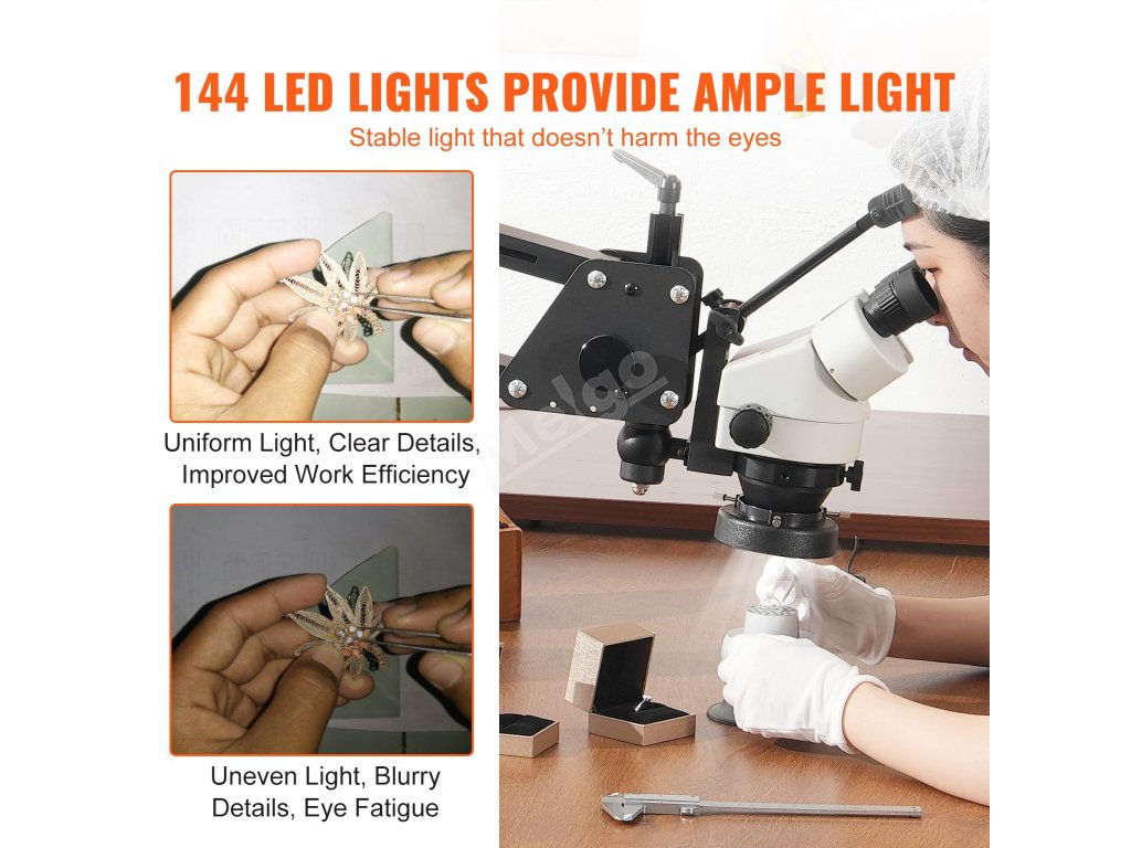Mikroskop se 144 LED světly poskytuje dostatečné osvětlení, má barevnou teplotu 6500-7000 K a svítivost 18 000-35 000 lumenů, klenot ve stojanu podporuje plynulé stmívání 0-100 %. Integrované kruhové LED světlo s rozhraním USB je široce použitelné a snadno se instaluje.