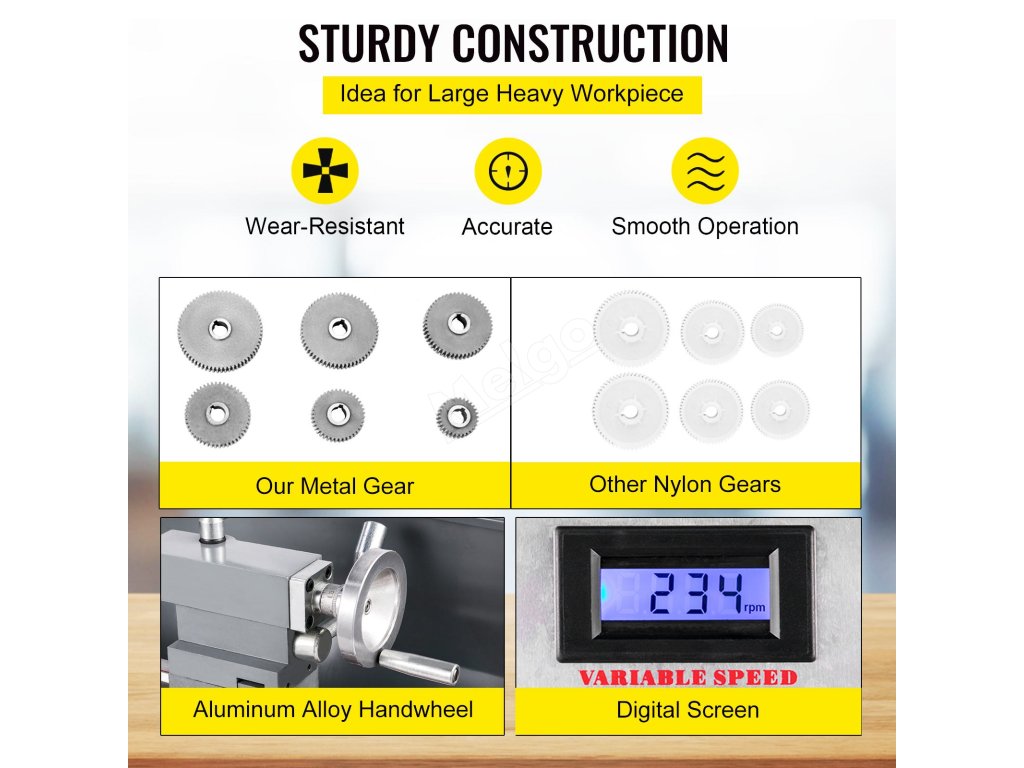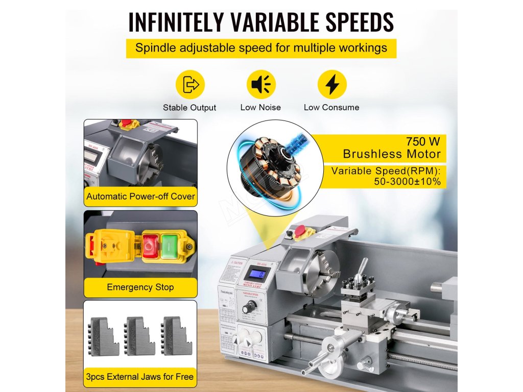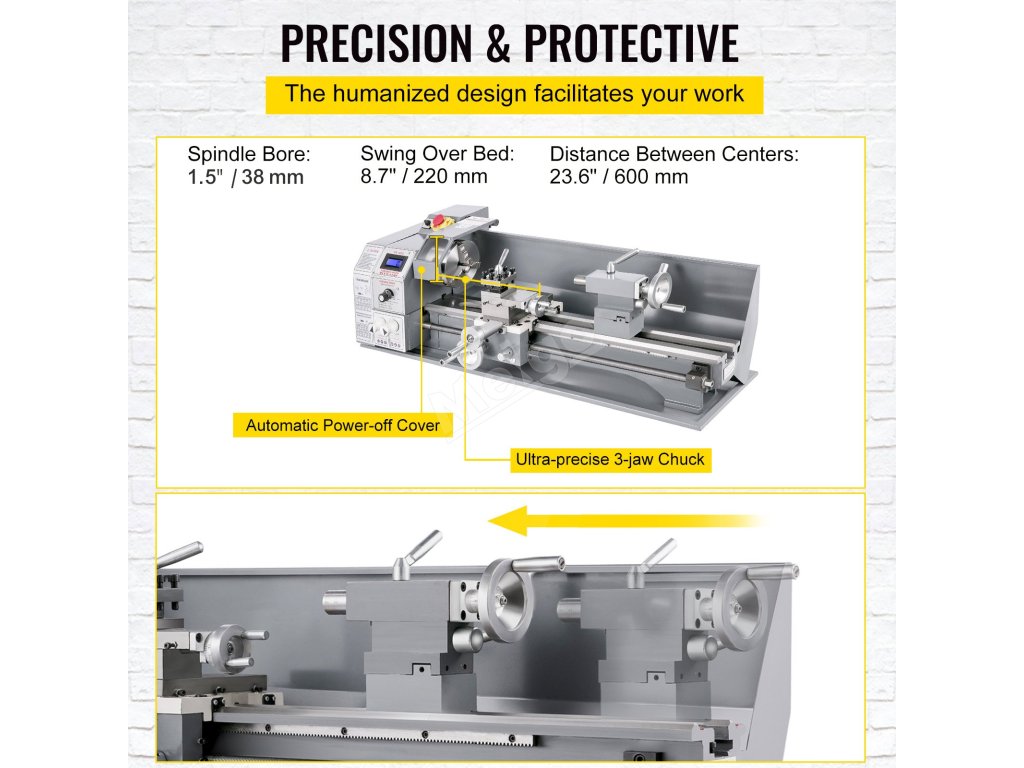 Přesný minisoustruh na kov o rozměrech 220 x 600 mm je vybaven 750W motorem, tříčelisťovým sklíčidlem, kuželovým vřetenem MT5, kuželovým koníkem MT2, je určen k provádění různých typů soustružení kovů a snadno se ovládá. Díky vysokofrekvenčnímu kalení a přesnému broušení kvalitního litinového lože. otáčky vřetena 500 - 3000 ± 10 % ot/min jsou plynule nastavitelné. Stabilní opěradlo a sledovač pro velké rozměry a/nebo těžké obrobky.