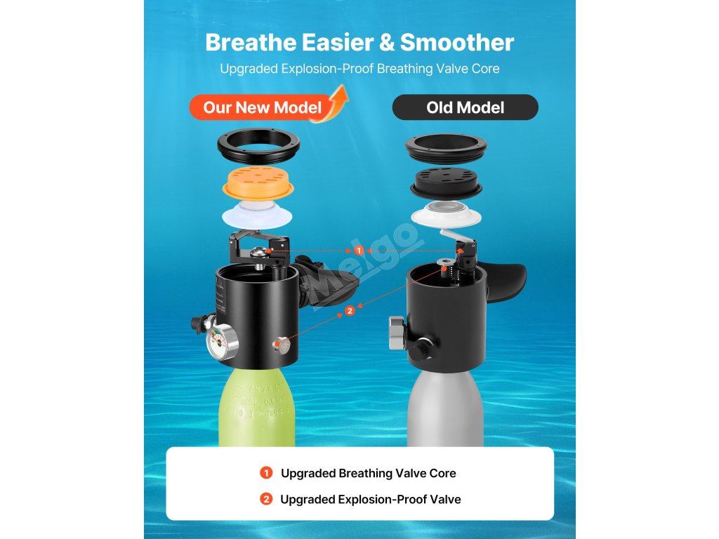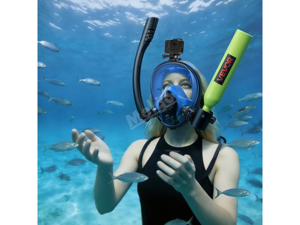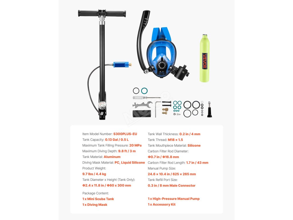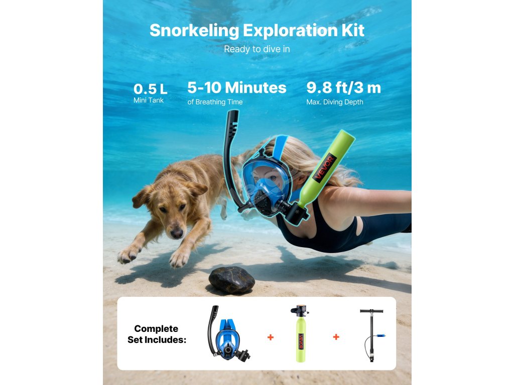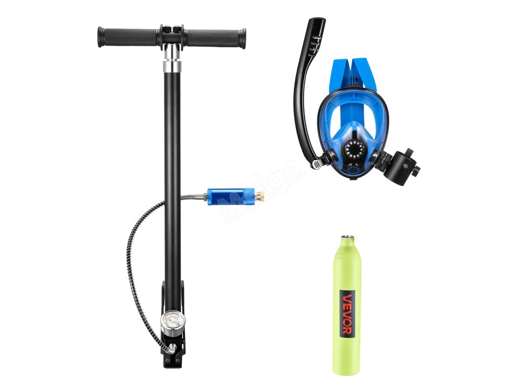 Ponořte se do mělké vody s jednou kompletní sadou! Tato mini souprava s potápěčskou nádrží poskytuje přibližně 5-10 minut dýchání pod vodou. Je vybavena celoobličejovou potápěčskou maskou a ruční pumpou, takže je ideální volbou pro šnorchlování na pláži i jako nouzová záloha.