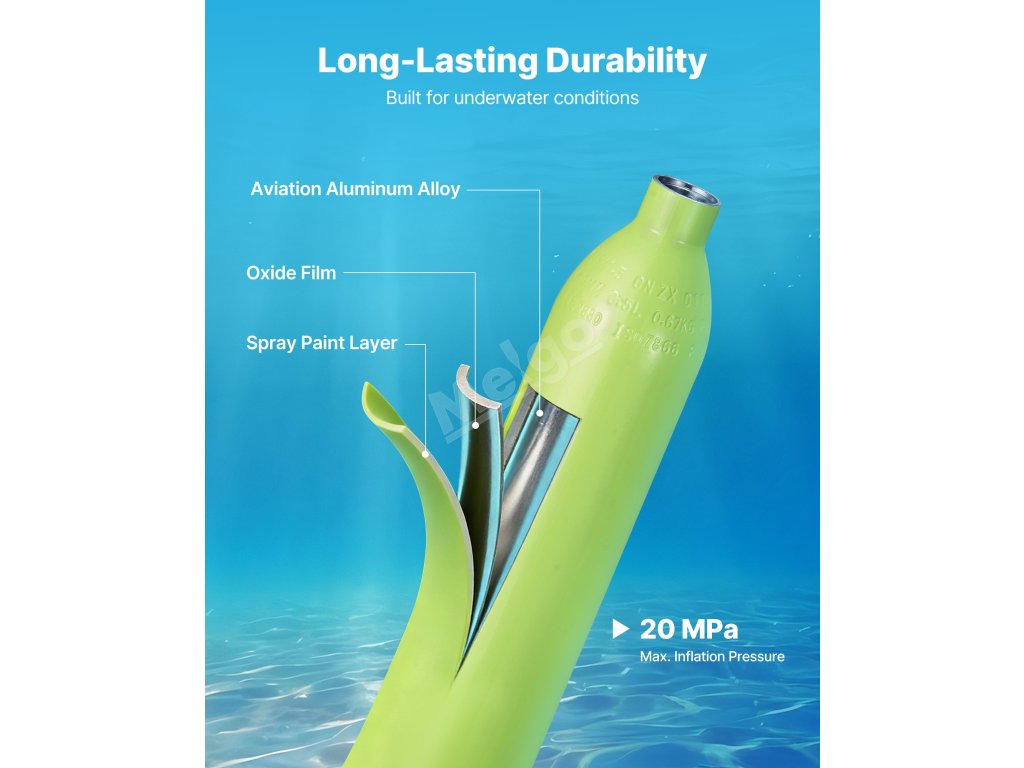 Potápěčská láhev je vyrobena z leteckého hliníku a prochází náročným testováním, aby odolala vysokému tlaku 20 MPa a drsným podmínkám pod vodou. Je to víc než jen láhev - je to spolehlivá základna pro podvodní aktivity, navržená pro použití v reálném světě.