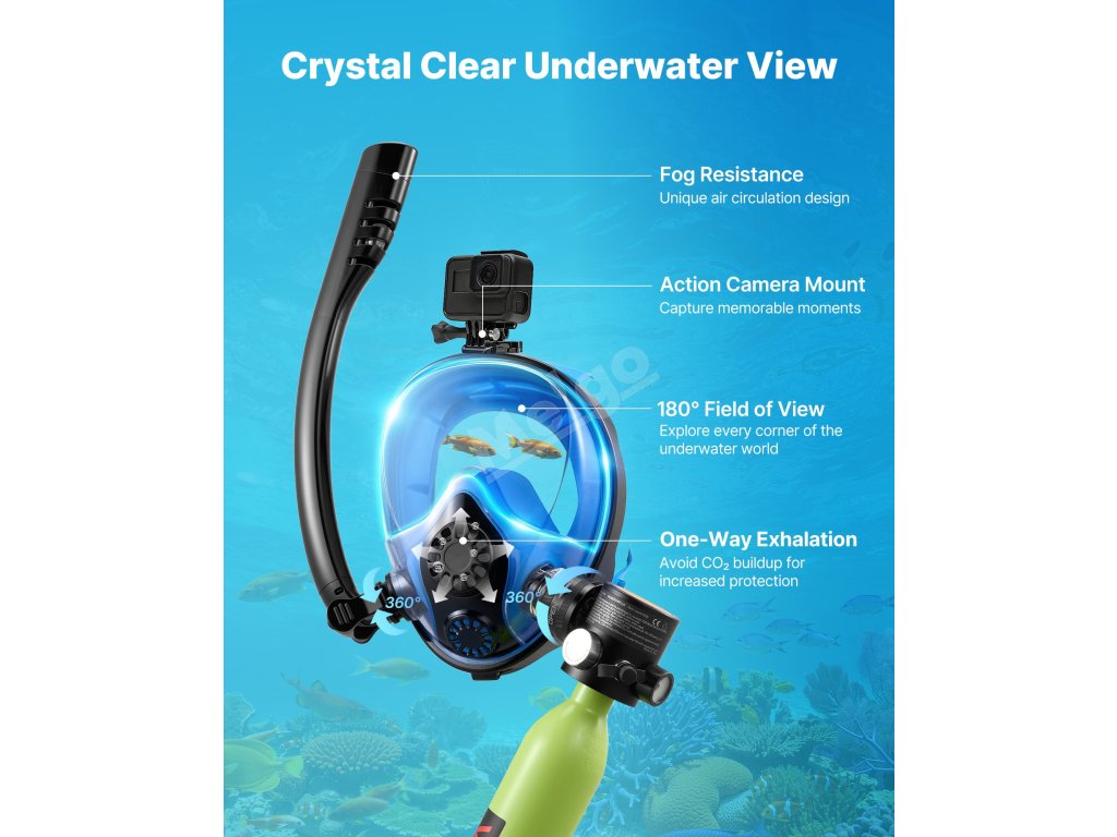 Celoobličejová potápěčská maska naší potápěčské láhve je vybavena technologií odolnou proti zamlžování a měkkou silikonovou podšívkou v kombinaci se dvěma dýchacími trubicemi pro široký výhled a pohodlné nošení. Horní držák fotoaparátu vám umožní snadno zachytit okamžiky - aniž byste museli držet fotoaparát!