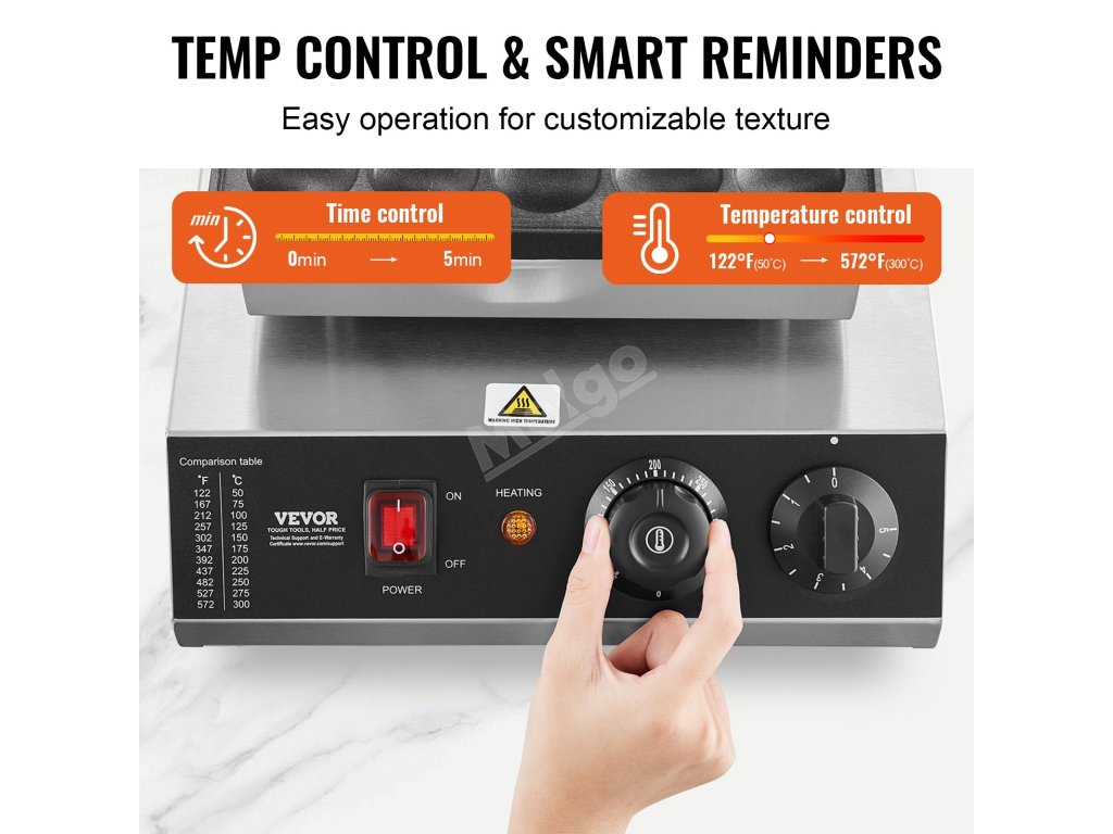 Je vybaven přesným časovačem a knoflíkem pro nastavení teploty, které jsou zřetelně označeny. Když je vafle připravena, vydá jasný zvukový signál. Výrobník dorayaki využívá uzavřenou technologii ohřevu, která zajišťuje rovnoměrný ohřev, rychlé tvarování a snadnou výrobu chutných palačinek.