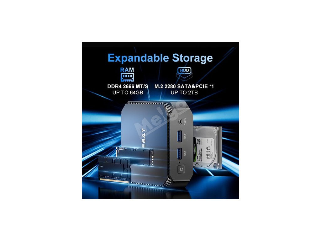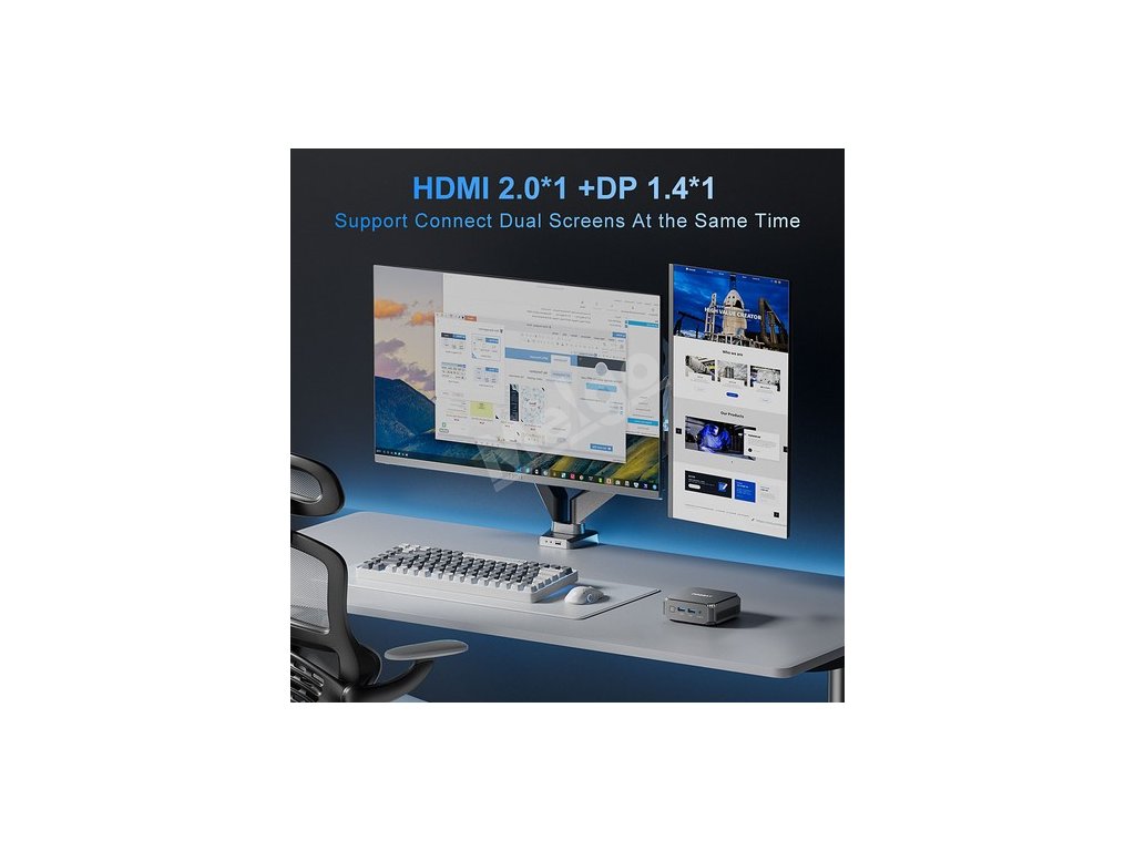 Mini počítač FIREBAT T2 je vybaven rozhraním USB 3.2*2 (až 5 Gb/s/S), USB 2.0*2, DP1.4*1, HDMI(4K@60Hz)*1, podporuje gigabitový Ethernet, WiFi 5 a vestavěné rozhraní Bluetooth 4.2, které se snadno spáruje s různými externími zařízeními a zajišťuje velmi rychlé připojení, plynulejší streamování a rychlejší stahování. Umožňuje současné připojení dvou displejů s rozlišením 4K, přičemž 1000MHz profesionální grafika Intel zajišťuje výstup UHD videa a flexibilní multitasking.