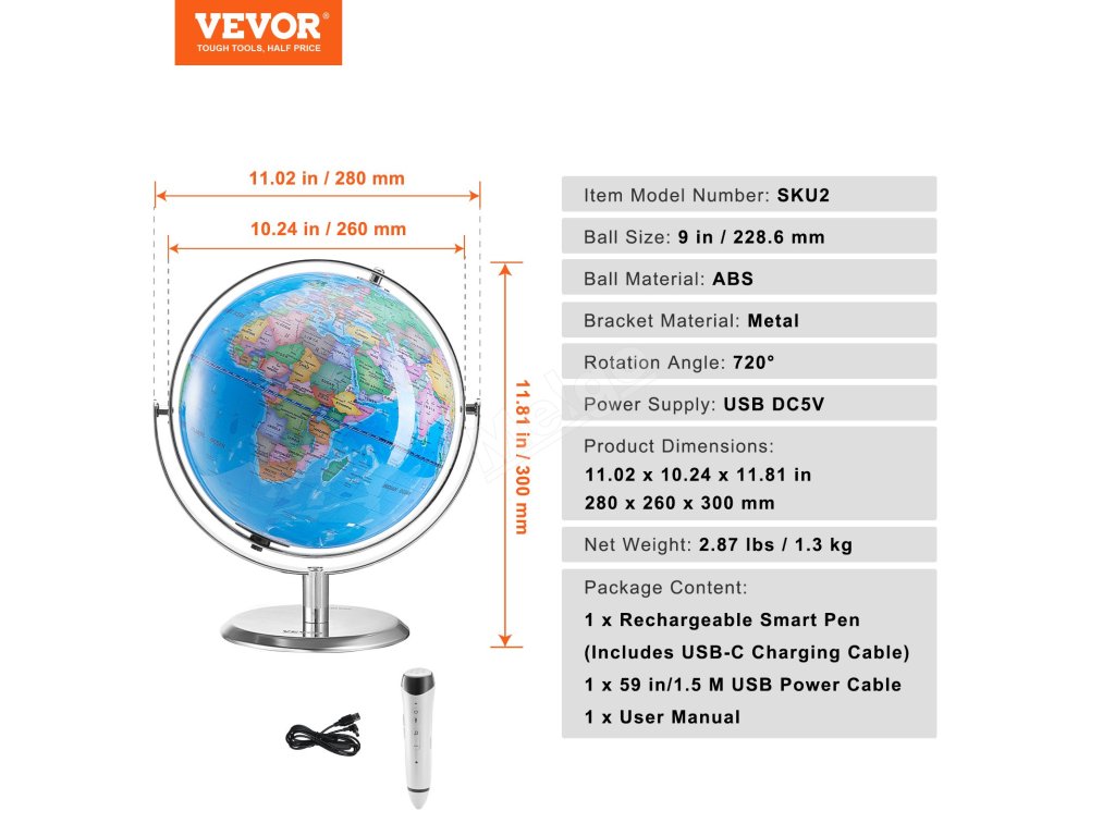 Mluvící glóbus 9 in/228.6 mm, pero, led noční světlo usb, angličtina
