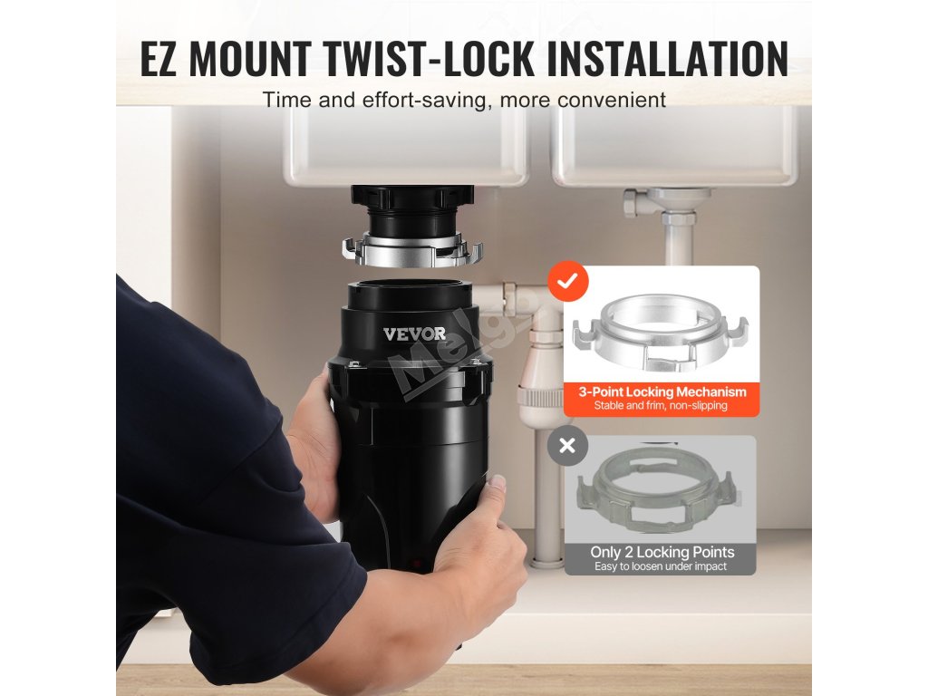 Instalace tohoto kuchyňského drtiče odpadu je snadná díky systému EZ mount twist-and-lock. Potřebné montážní příslušenství je součástí dodávky - není třeba žádné další složité nářadí ani pomoc. Začněte pracovat rychle a bez námahy.