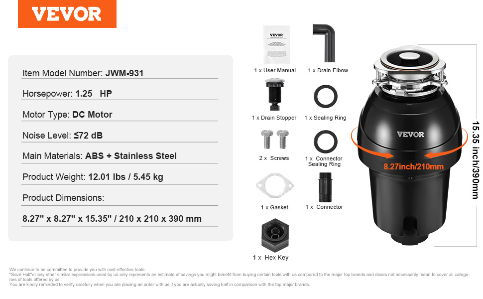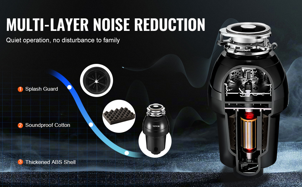 Tento drtič odpadků s vícevrstvou zvukovou izolací včetně ochran proti stříkající vodě, zvukotěsné bavlny a zesíleného pláště z ABS pracuje s hlučností ≤72 dB, takže si můžete užívat tiché kuchyně bez rušivého hluku.