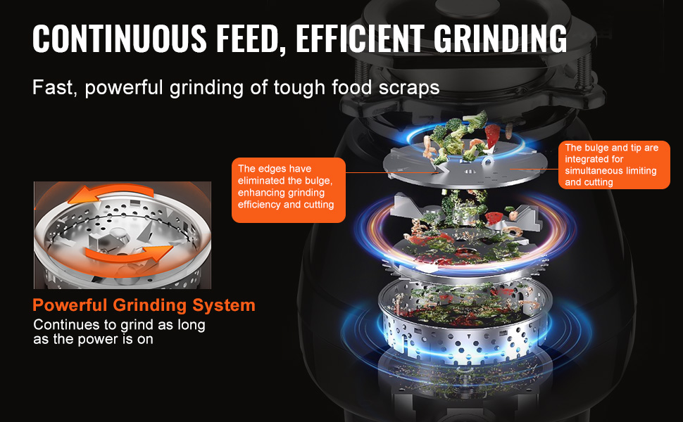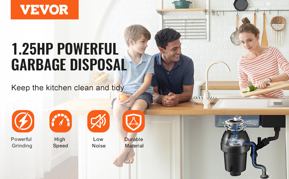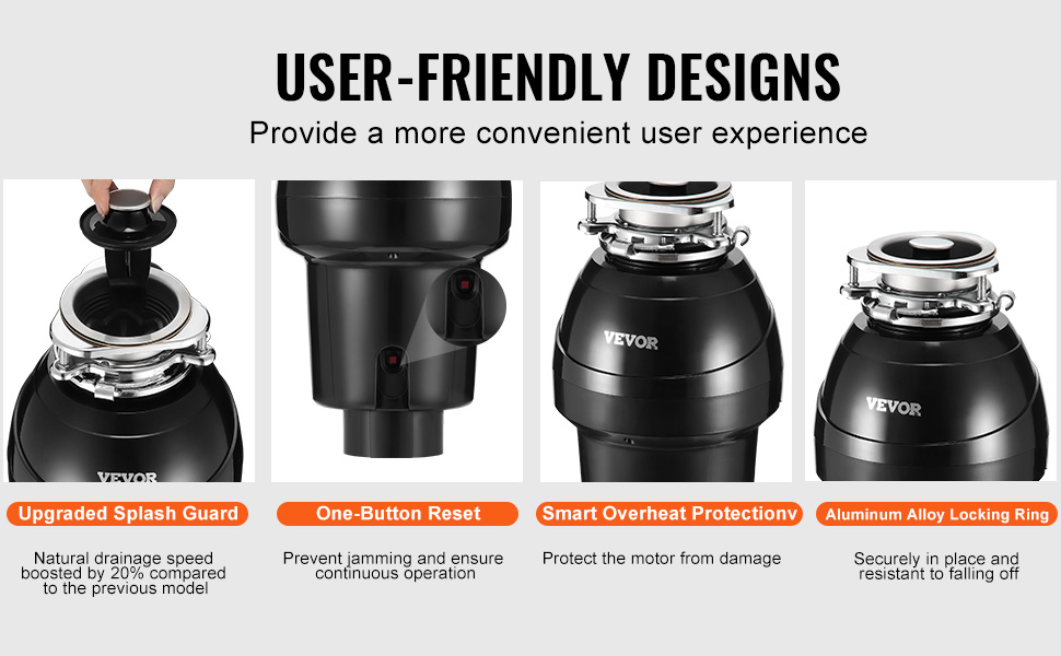 Zažijte větší pohodlí díky propracovaným funkcím. Tlačítko pro ruční resetování zabraňuje zaseknutí; inteligentní ochrana proti přehřátí chrání motor před poškozením; vylepšená ochrana proti rozstřiku účinně snižuje rozstřikování, udržuje vaši kuchyni čistou a zároveň efektivně zpracovává odpad z potravin.