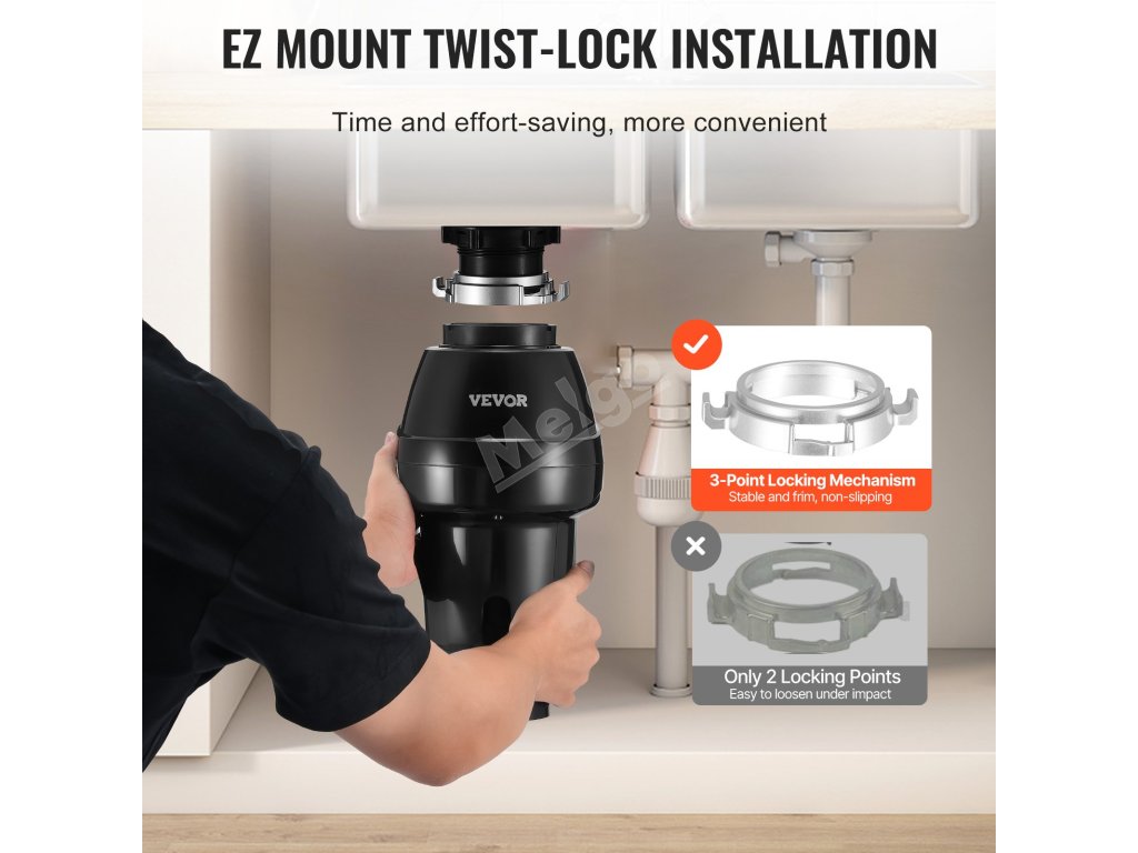 Vďaka systému inštalácie EZ mount twist-and-lock sa tento drvič kuchynského odpadu z drezu ľahko inštaluje. Potrebné montážne príslušenstvo je súčasťou balenia - nie sú potrebné žiadne ďalšie zložité nástroje ani pomoc. Začnite pracovať rýchlo a bez námahy.