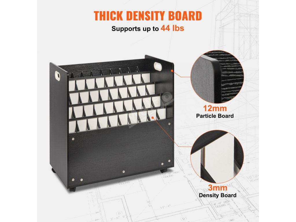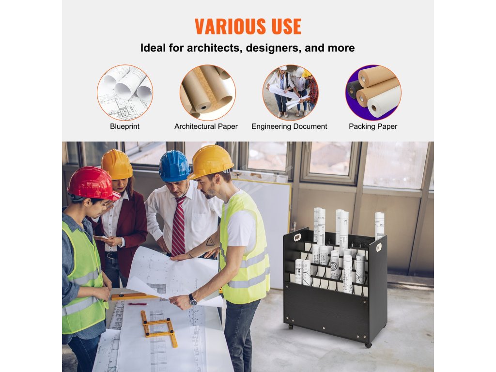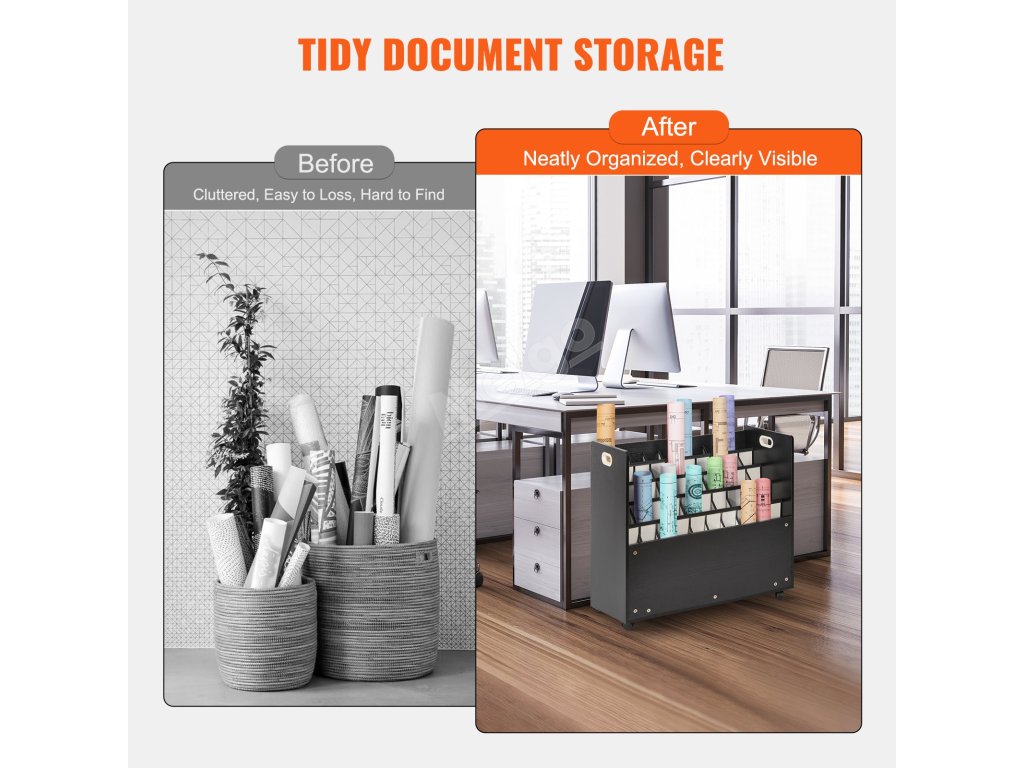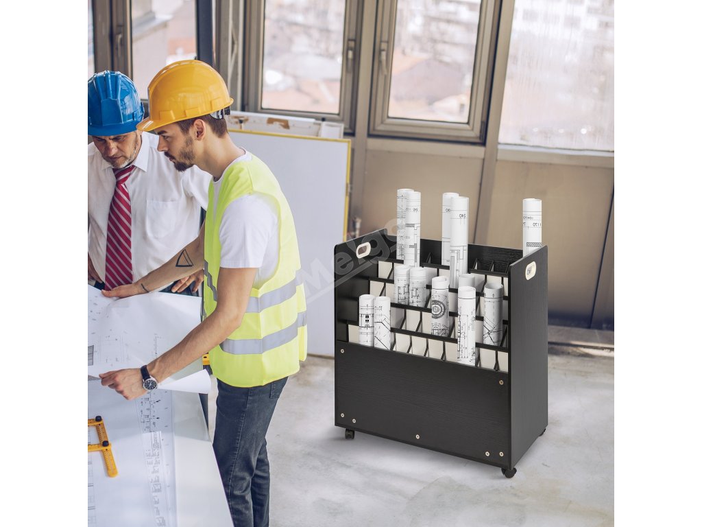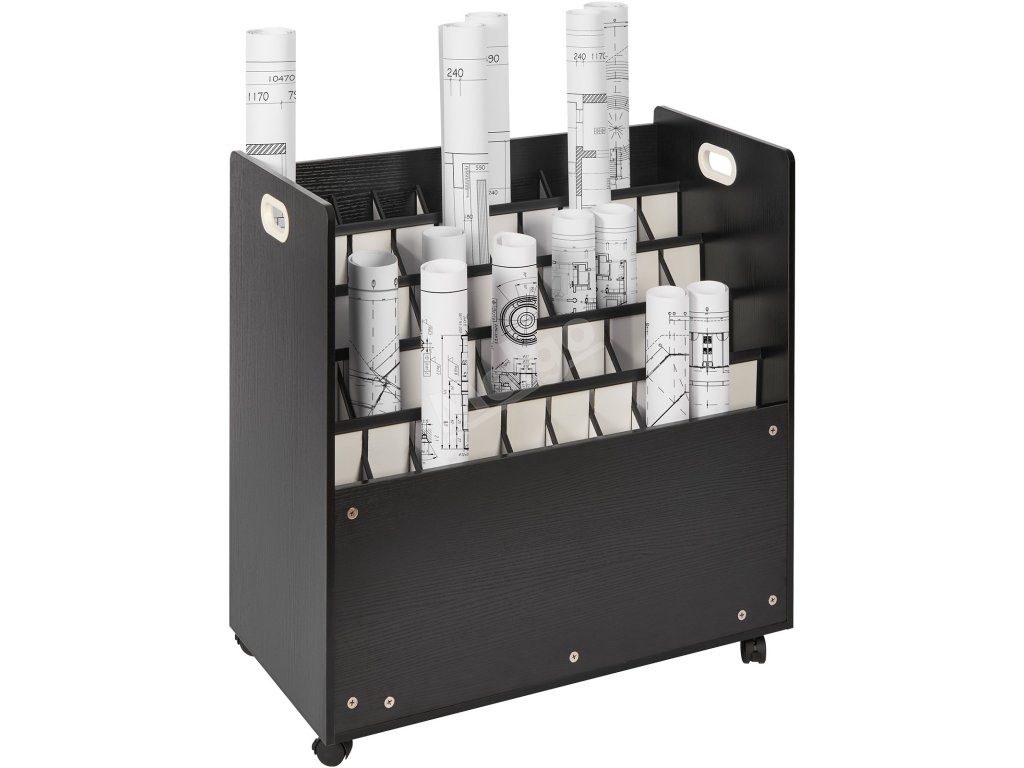 Tento organizér pro ukládání plánů je vyroben z robustní MDF desky a má pečlivě ošetřené všechny povrchy a vyznačuje se víceúrovňovou strukturou. Efektivně uchovává srolované dokumenty různých délek, které jsou uspořádané a snadno přístupné.