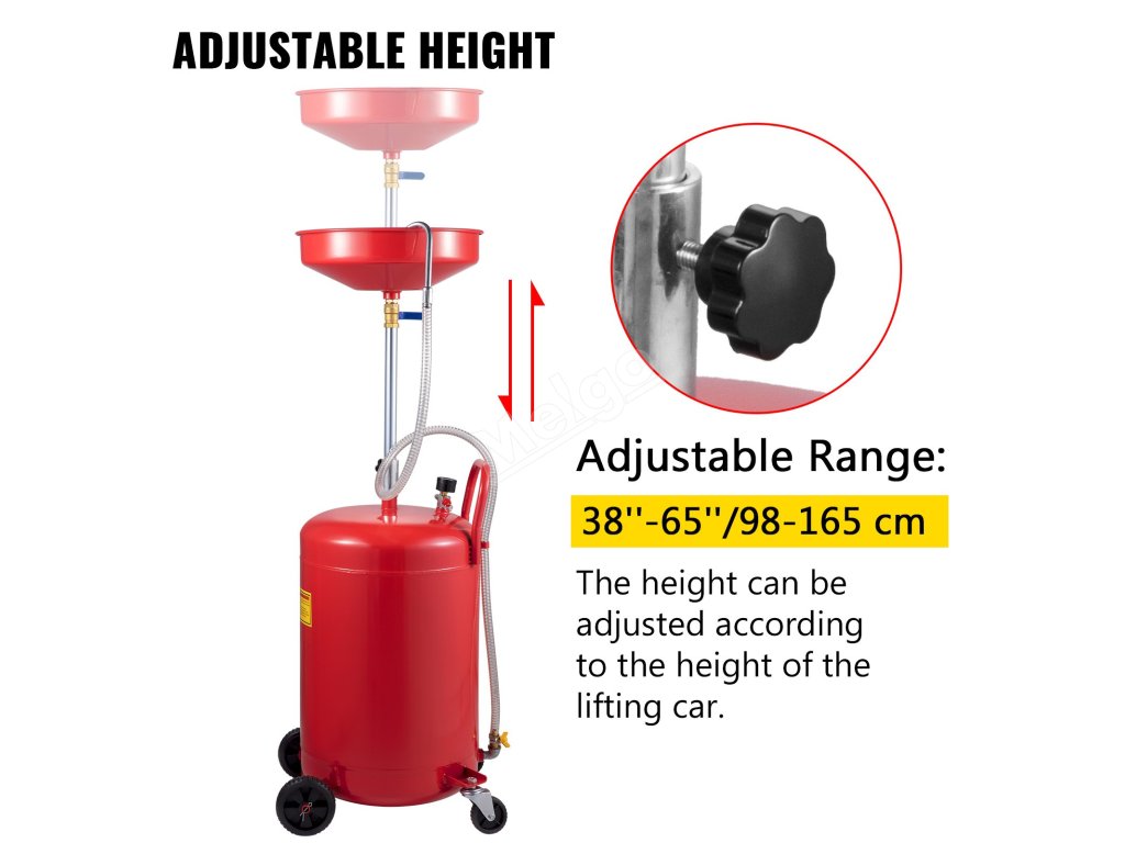 Výšku nálevky lze nastavit od 38 cm do 65 cm. Lze ji libovolně nastavit podle vlastních potřeb. Funguje dobře s jakýmkoli dílenským automobilovým zvedákem.