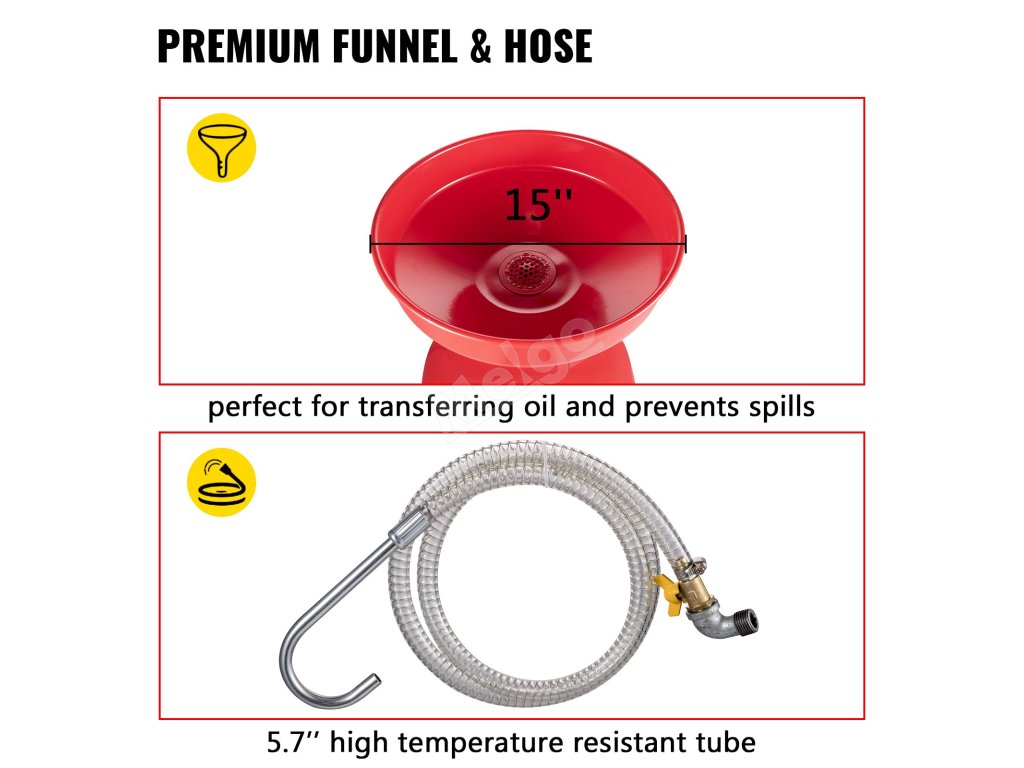 Tento 15palcový filtrovaný trychtýř zachytí každou kapku oleje bez přetečení. Je dodáván s hadicí odolnou proti vysokým teplotám a dokáže rychle vypustit olej, nemrznoucí směs a další kapaliny.