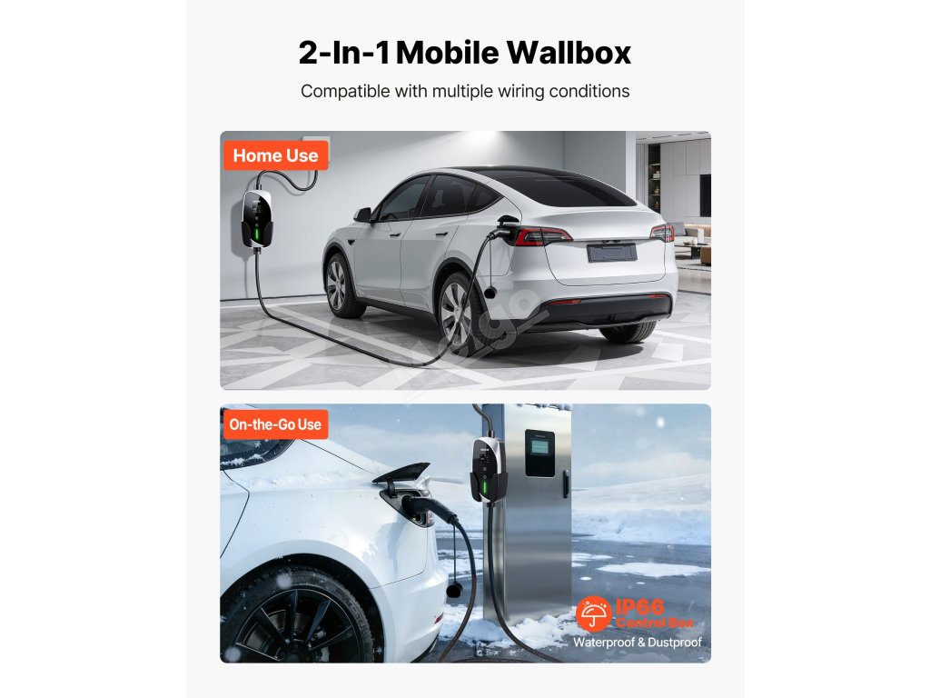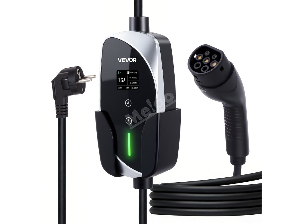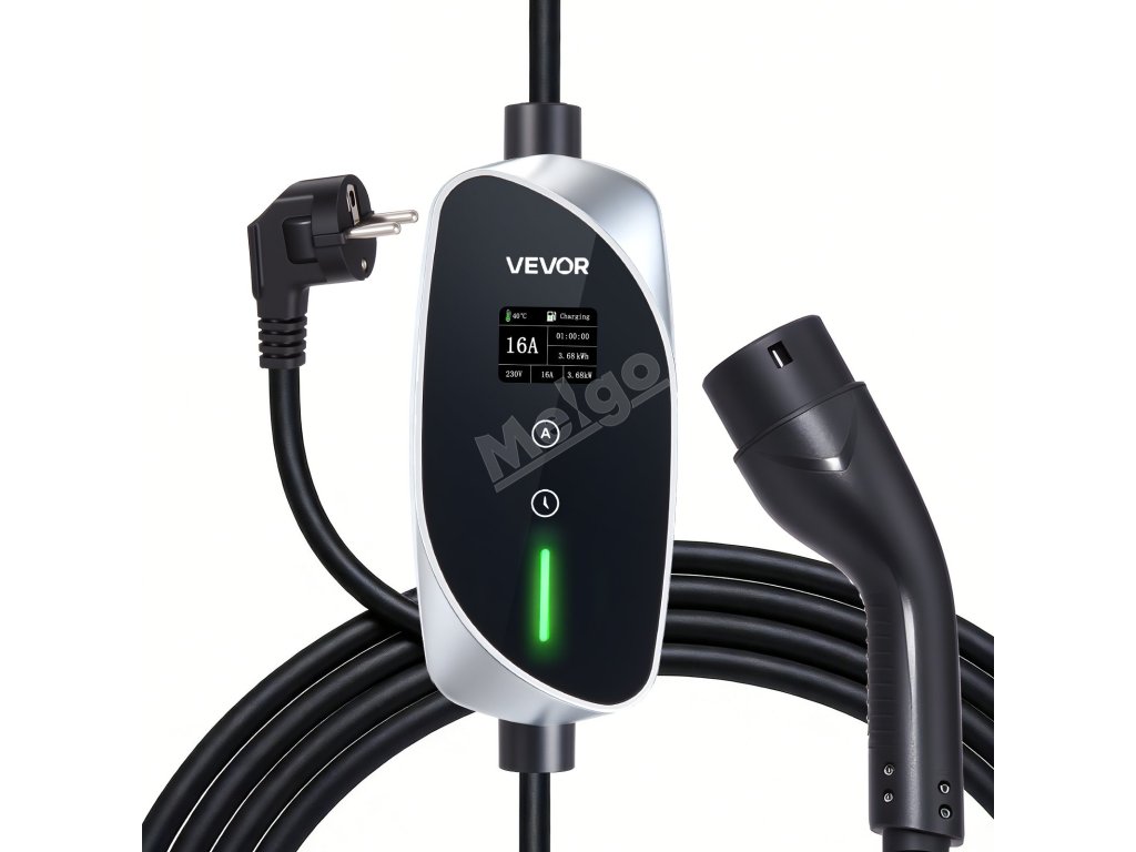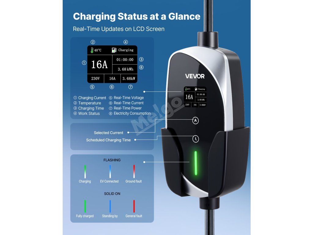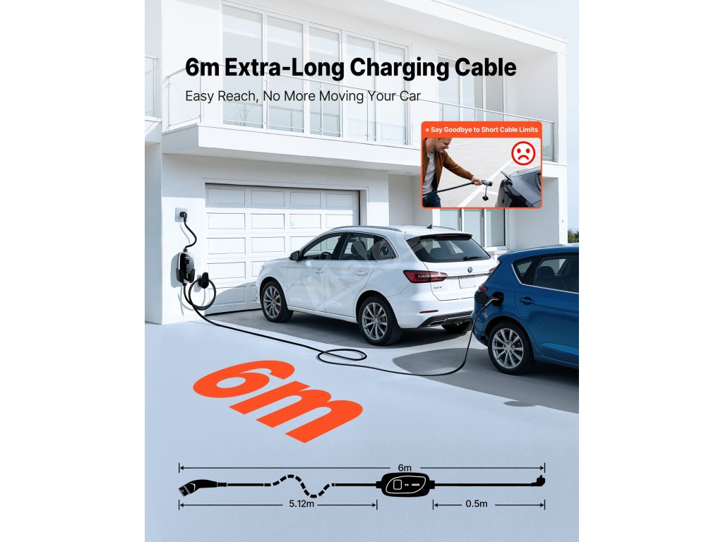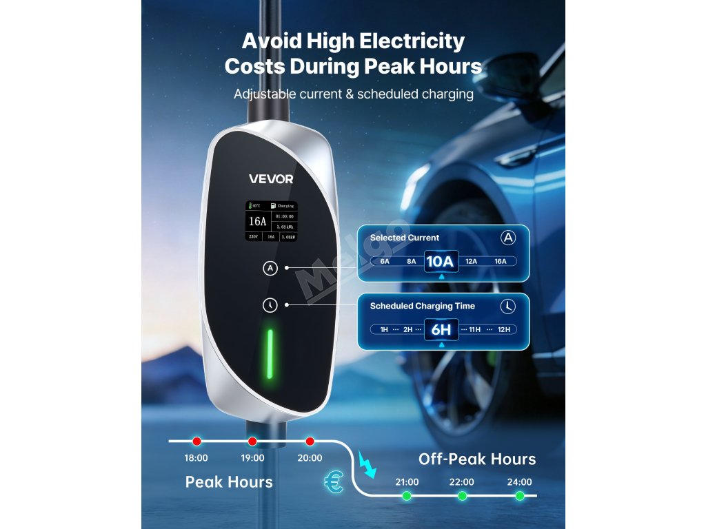 Tato mobilní nabíječka má nastavitelný proud 6-16 A a 6m nabíjecí kabel z TPU, který snadno dosáhne přes parkovací místa. Naplánujte si odložené nabíjení o 1-12 hodin, abyste se vyhnuli nákladům na elektřinu ve špičce. Displej LCD zobrazuje stav v reálném čase, zatímco několik ochran umožňuje spolehlivé nabíjení v dešti nebo sněhu.