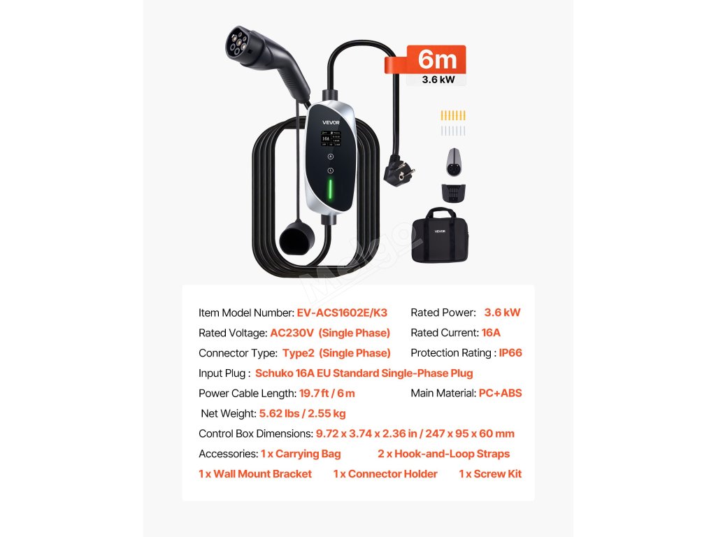 Mobilní wallbox 3.6 kW 16A typ 2, 6 m kabel, schuko 16A, lcd