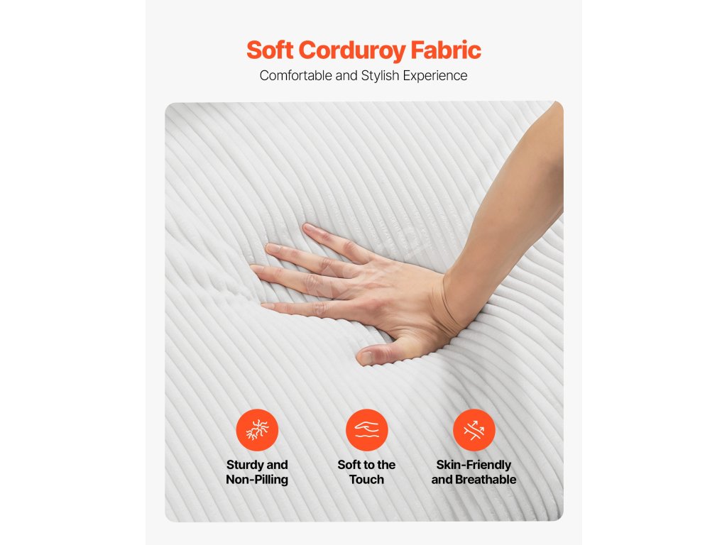 Pružinové cívky a pěna 28D s vysokou hustotou se přizpůsobí přirozeným křivkám vašeho těla a poskytují vynikající oporu a pohodlí. Měkká, prodyšná manšestrová tkanina zajišťuje dlouhotrvající pohodlí po celou dobu používání.