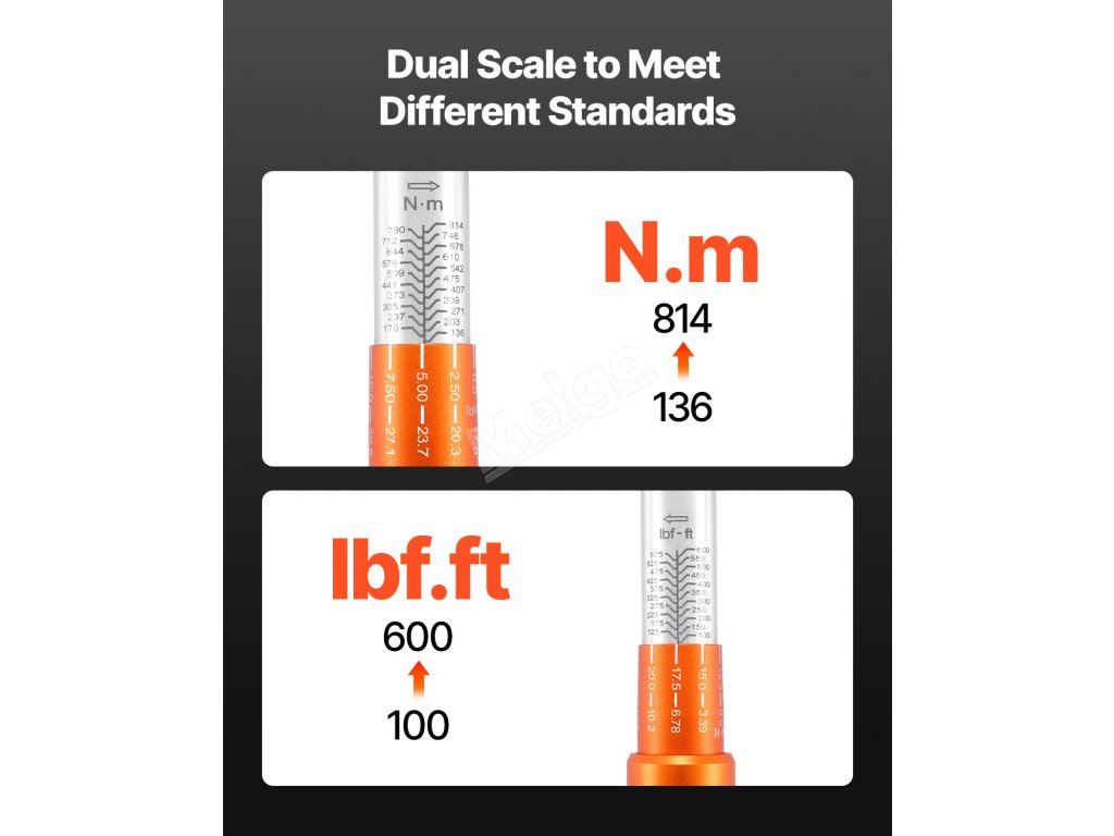 Obousměrný momentový klíč je vybaven laserem gravírovanými stupnicemi pro jasné a přesné odečty i za zhoršených světelných podmínek. Konstrukce se dvěma stupnicemi rozšiřuje univerzálnost klíče, takže je vhodný pro širší škálu úkolů.