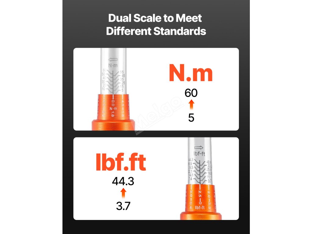 Obousměrný momentový klíč je vybaven laserem gravírovanými stupnicemi pro jasné a přesné odečty i za zhoršených světelných podmínek. Konstrukce se dvěma stupnicemi rozšiřuje univerzálnost klíče, takže je vhodný pro širší škálu úkolů.