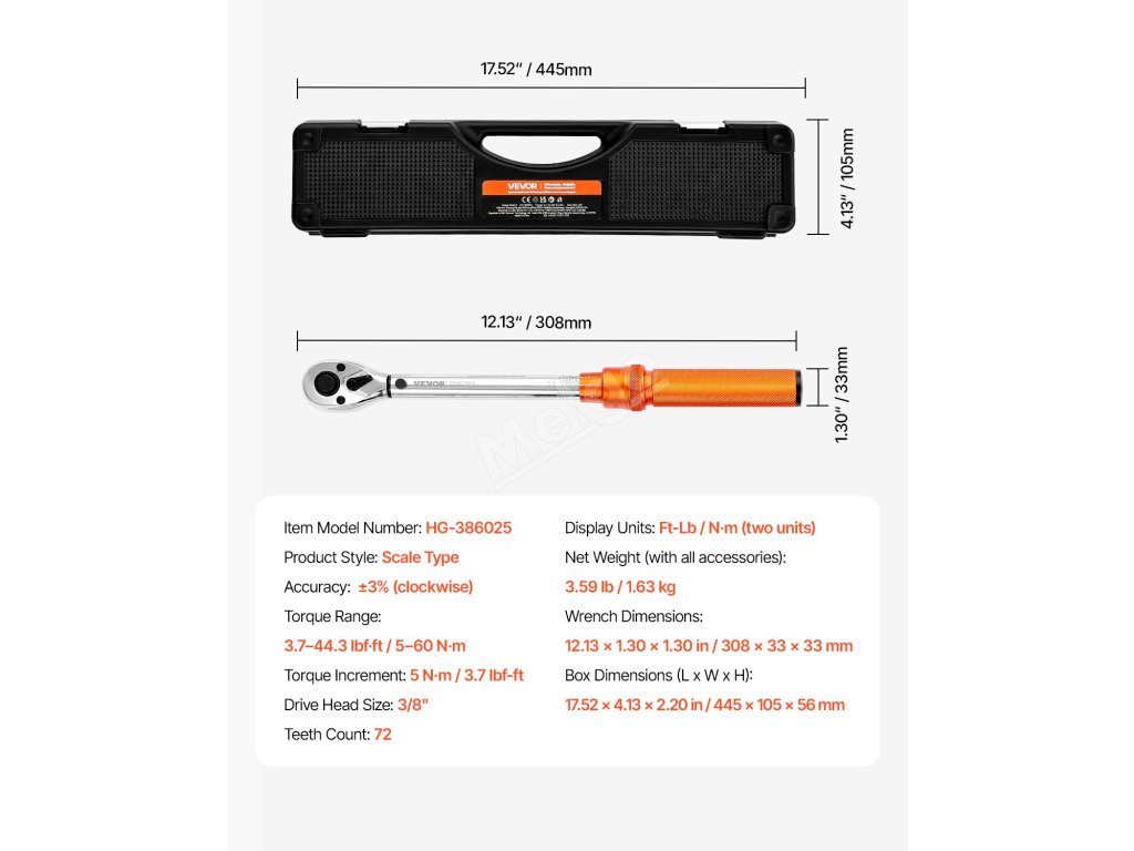 Momentový klíč click 3/8" 5-60 n.m ±3% obousměrná sada hlavic
