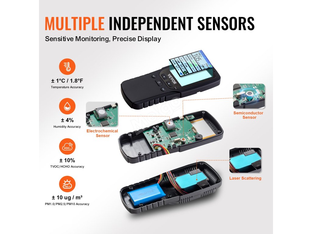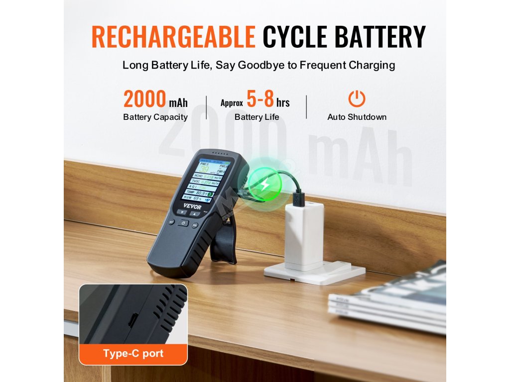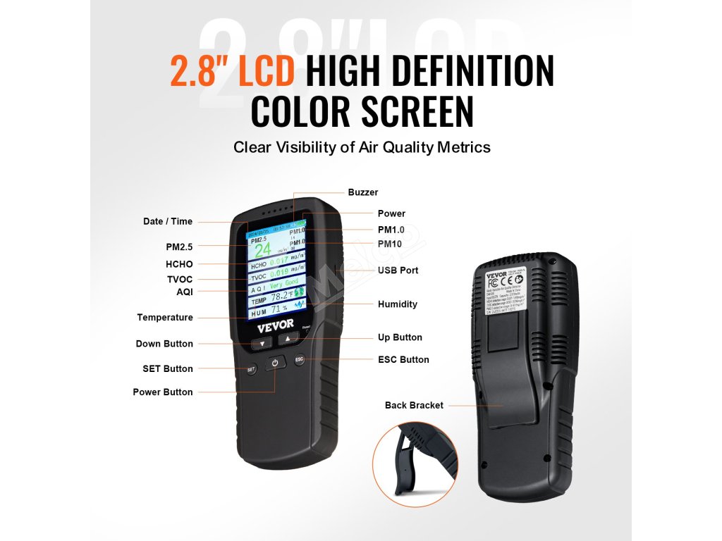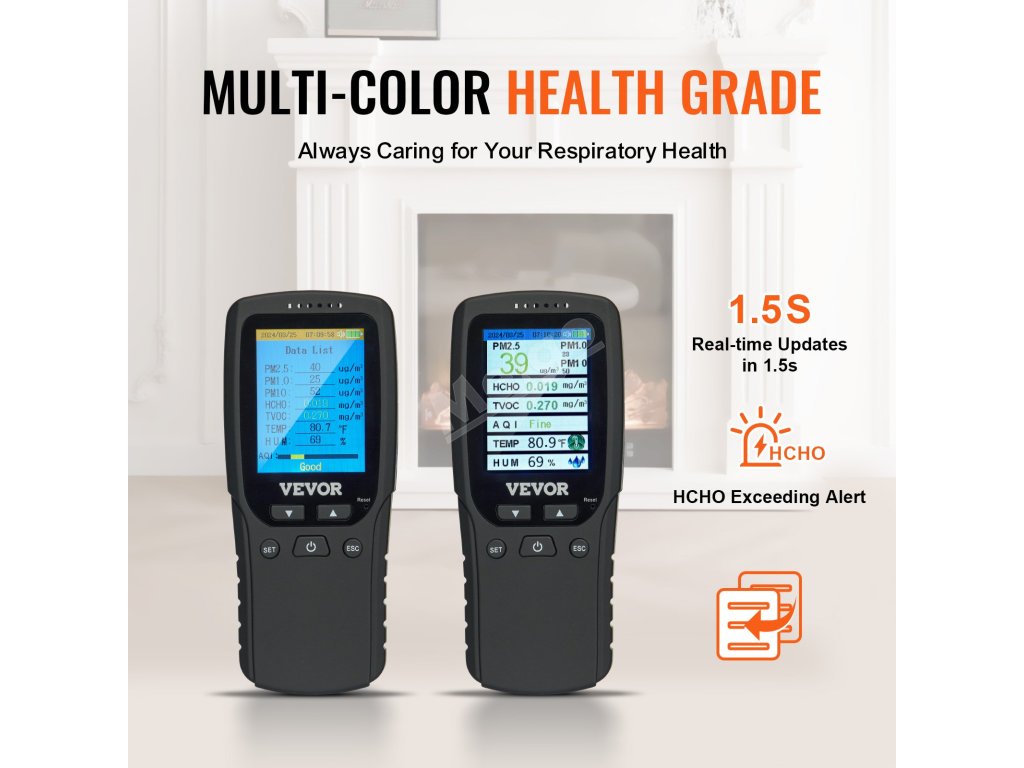 Tento multifunkční detektor kvality ovzduší monitoruje v reálném čase částice PM2,5, PM10, TVOC, HCHO, vlhkost a teplotu. Je vybaven velkou barevnou obrazovkou HD pro okamžité aktualizace a obsahuje dobíjecí lithiovou baterii s nabíjecím kabelem typu C pro neomezenou a komplexní detekci v jakémkoli okamžiku.